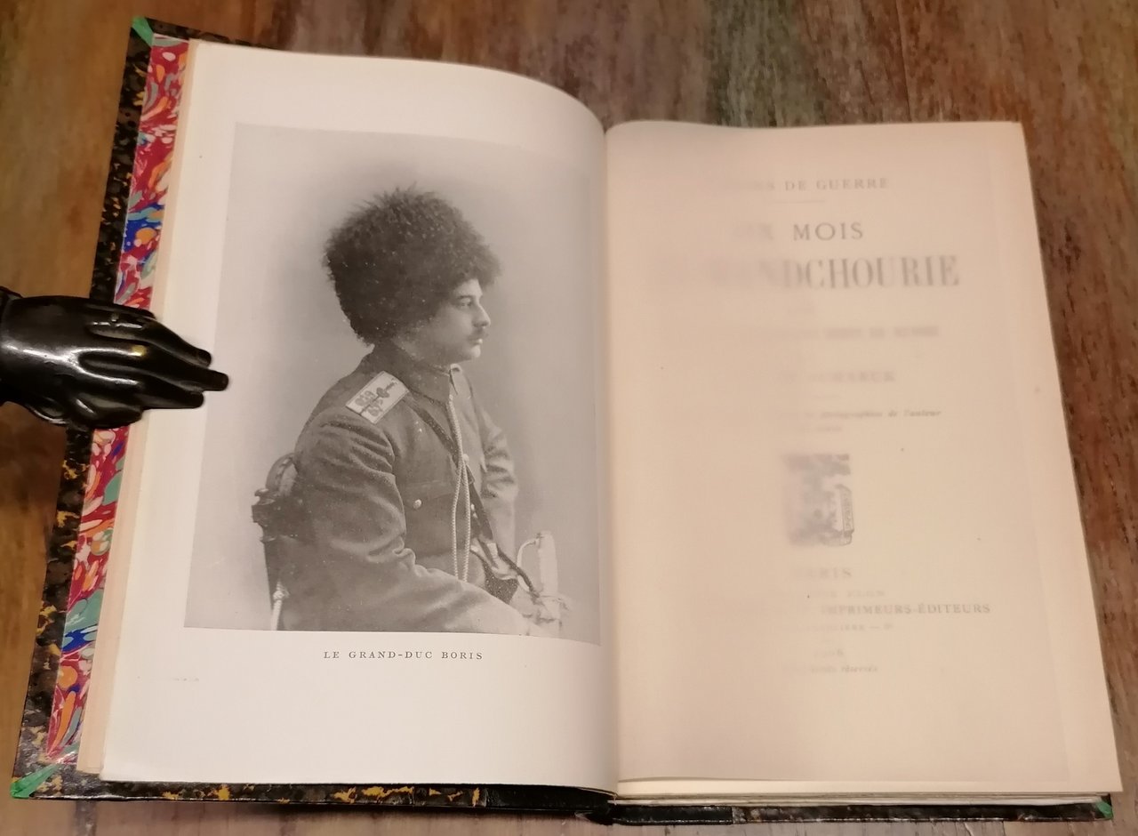 (Guerra russo-giapponese 1904-1905 - Estremo oriente asiatico - Manciuria - Granduca Boris Vladimirovic Romanov - Cina) In 16° grande (cm 19,5 x 14), legatura coeva in mezza pelle, dorso a 5 nervi con titoli in oro, carta marmorizzata ai piatti ed alle guardie, taglio di testa dorato, pp. X,278, con ritratto del Granduca Boris protetto da velina in antiporta, 41 tavole fotografiche in bianco e nero fuori testo (come da Indice) ed una carta geografica più volte ripiegata in fine. Volume solido e ben conservato.