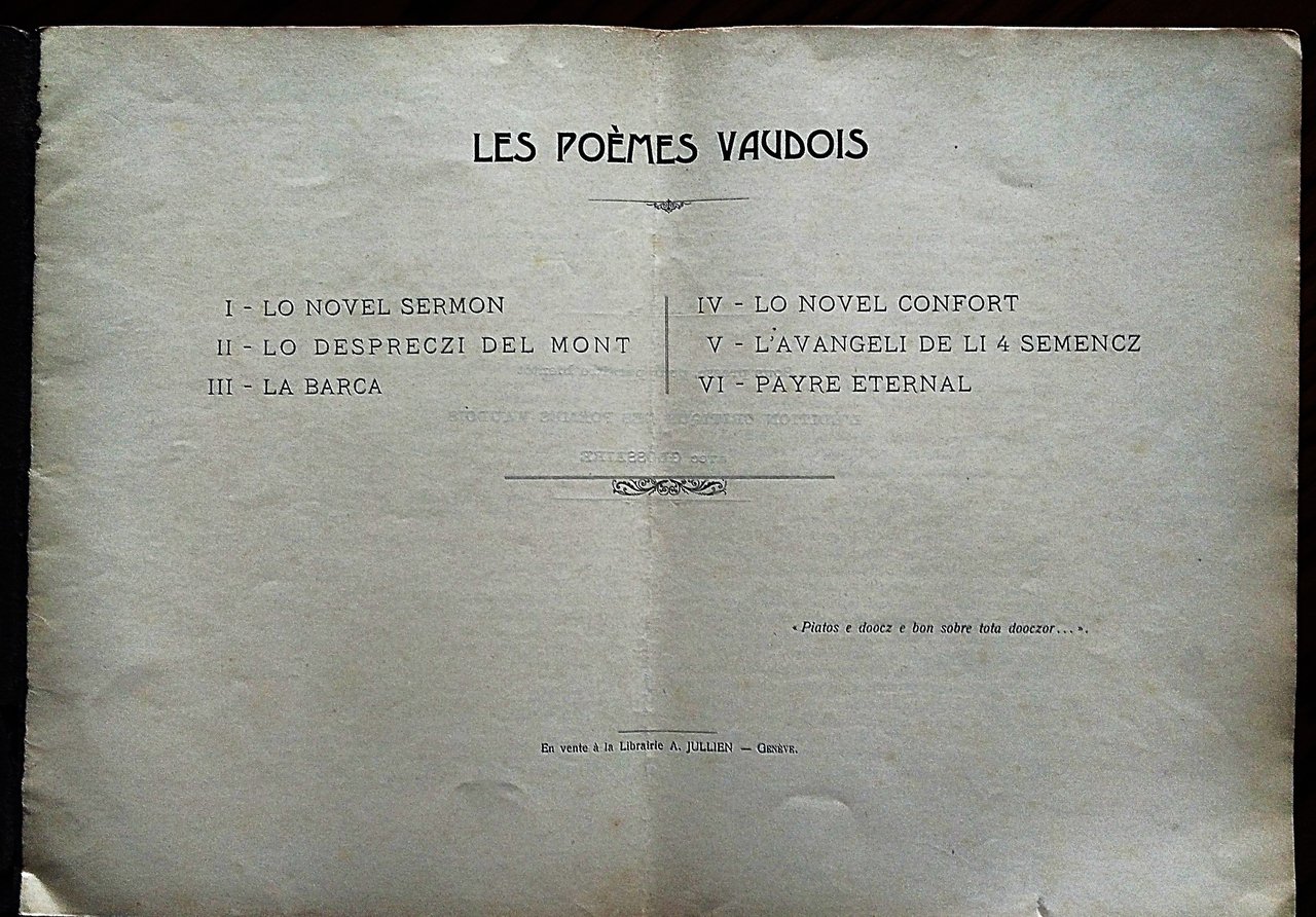 Geneve, Libraire A. Jullien, 1910. 4° oblungo, pp. 124, brossura editoriale. Uno strappetto senza perdita al margine inferiore bianco, piccoli difetti e tracce d'uso, buona copia. Testo su due colonne.