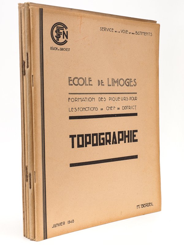 6 vol. in-4 br., Service de la Voie et des Bâtiments, 1946-1948, 109, 111, 73, 43, 135, 44 pp. Liste des titres : SNCF : Ecole de Limoges. Formation des Piqueurs pour les fonctions de chef de district. Ouvrages d'Art (novembre 1946) - Topographie (janvier 1948) - Engins de Gare - Le matériel fixe de la Voie. Les Rails (septembre 1946) - Le matériel fixe de la voie. Les Bois (janvier 1947) - Téléphonie (septembre 1946) Bon ensemble (mouill. dans le dernier titre, bon état par ailleurs) peu courant. Prix du lot.