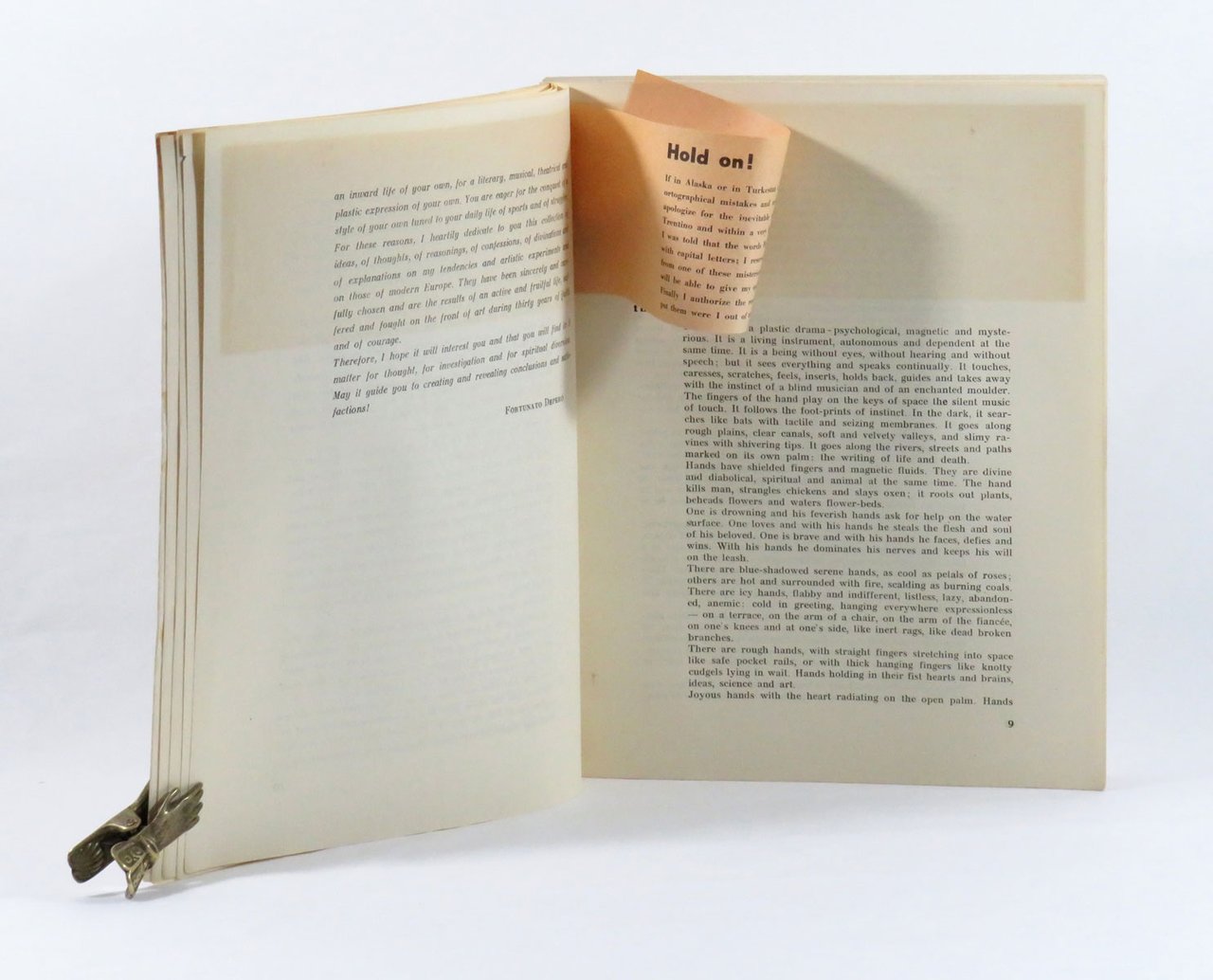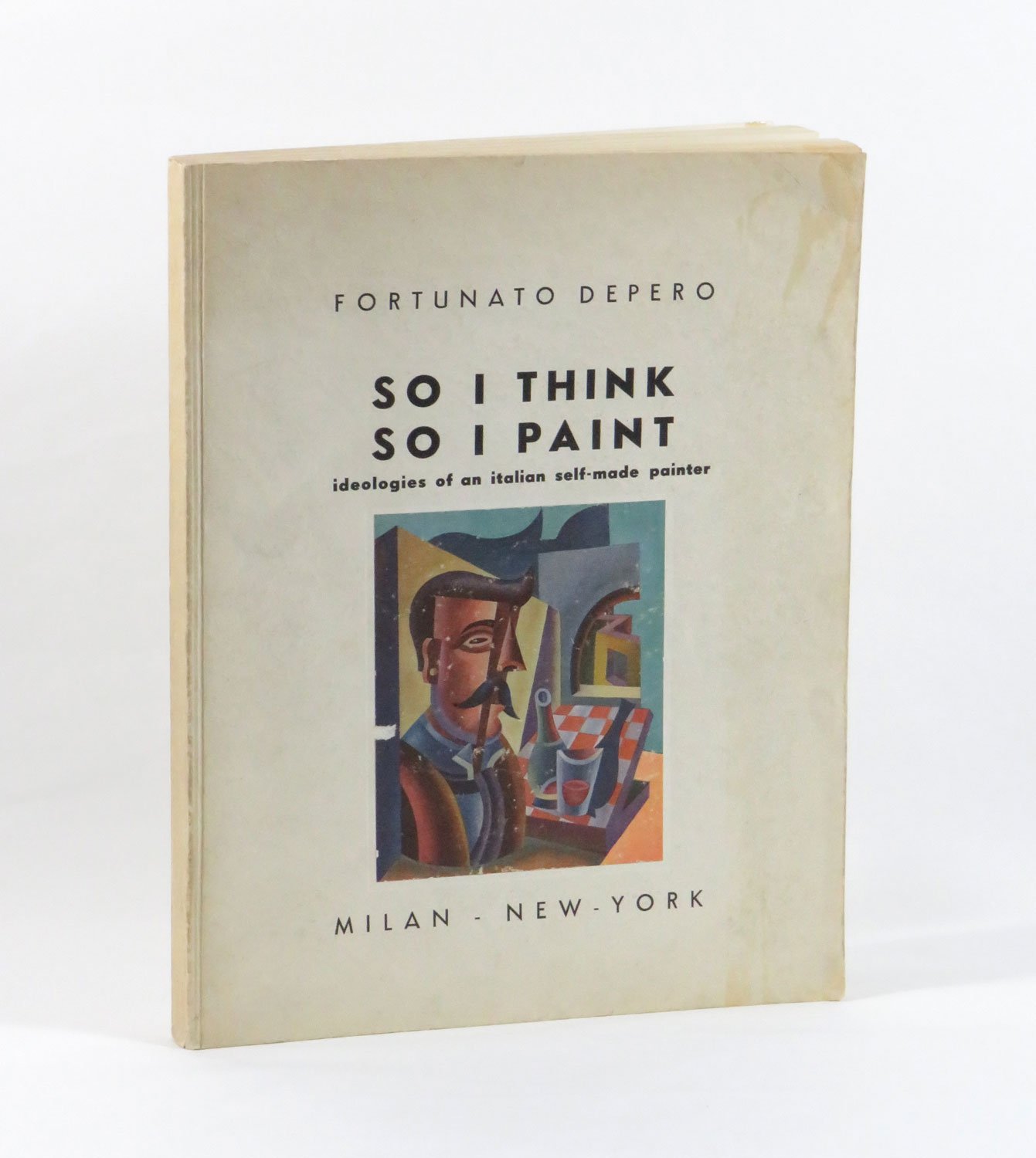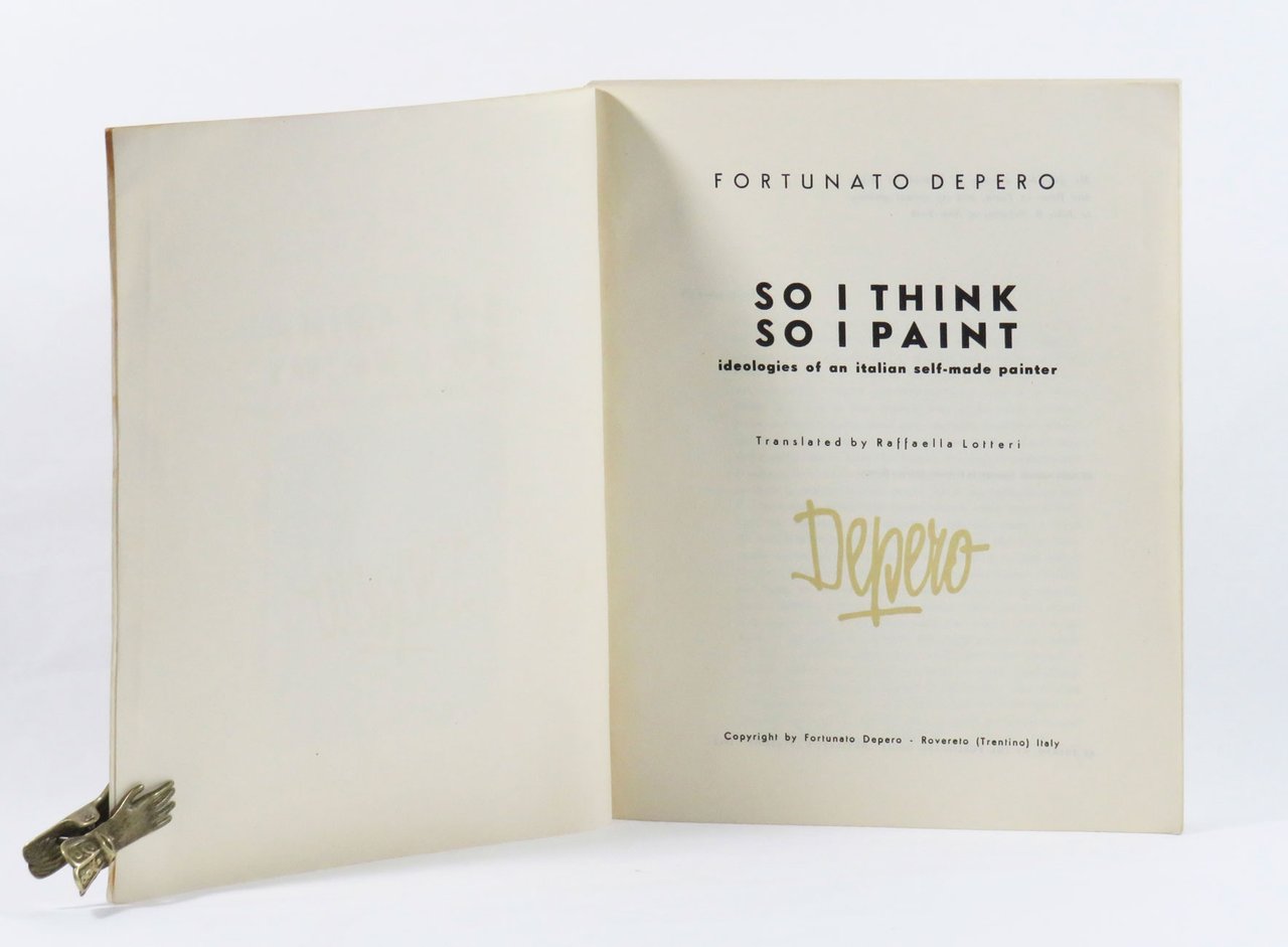 LIBROPrima edizione. Ottimo esemplare nella variante con illustrazione di copertina a colori (esiste anche con illustrazione di copertina in bianco e nero). Proveniente dalla collezione futurista di Giampiero Mughini.Testo inglese. Dedicatoria «My good-bye greeting to Mattioli of Milan and Bosso of Turin, and my arrival greeting to John B. Salterini of New-York». Dopo il «foreword» una striscia in carta colorata reca il messaggio «Hold On», invitando a scusare gli inevitabili “mistakes” e “misprints”. Imponente raccolta di scritti più o meno brevi, tra il teorico, tecnico e l’aneddotico, con ricca selezione iconografica. Giudizi sull’autore in fine.Cammarota, Futurismo, 169.17
