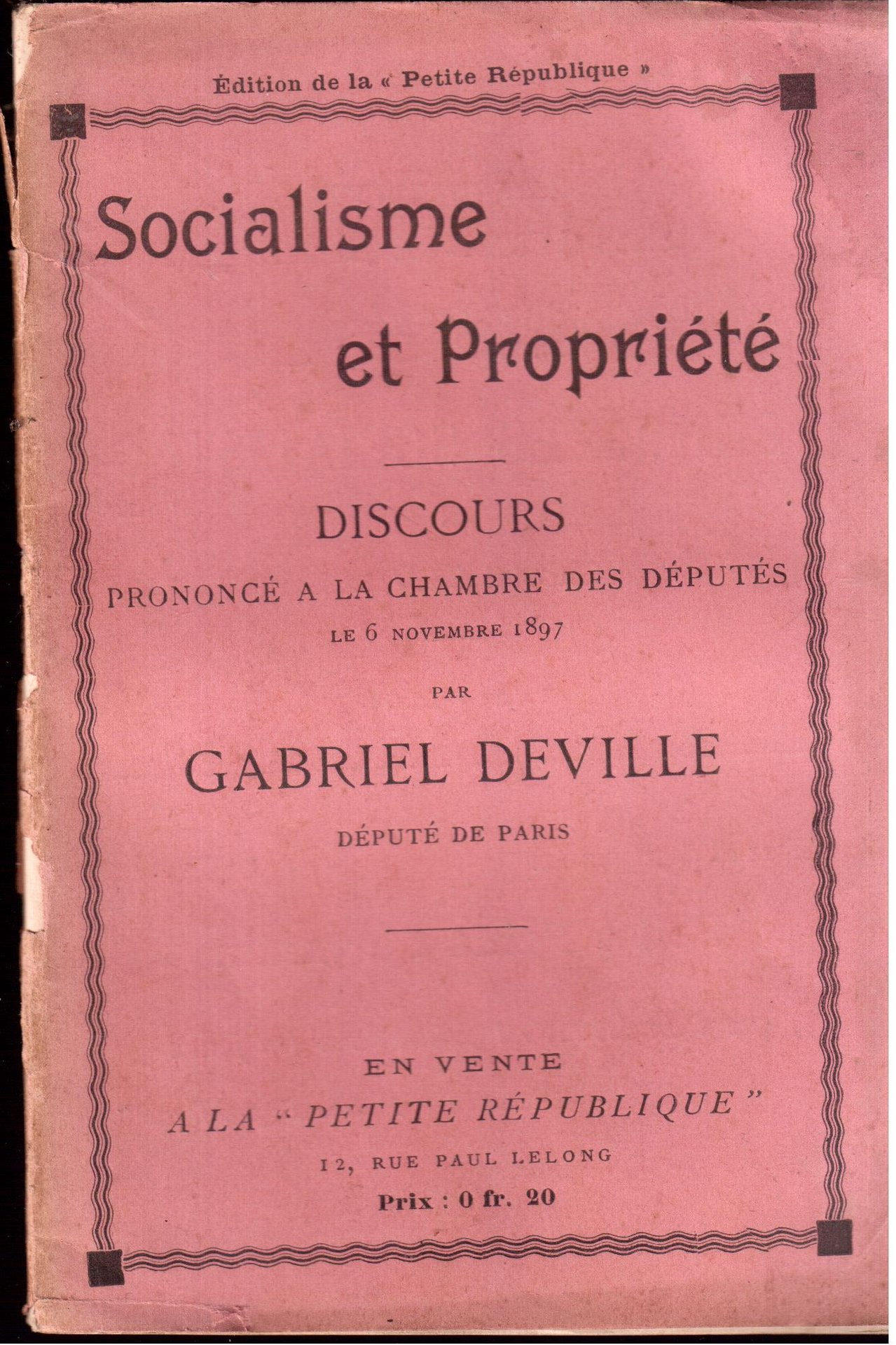 Socialisme et Propriété Discours prononcé a la Chambre de Députés le 6 novembre 1897 par Gabriel Deville député de Paris