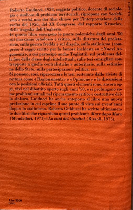 Roberto Guiducci, 1923, saggista politico, docente di sociologia e studioso di problemi territoriali, ripropone con Socialismo e verità uno dei libri chiave per l'interpretazione della svolta del 1956, del XX Congresso, del rapporto Krusciov, della tragedia dell'Ungheria.