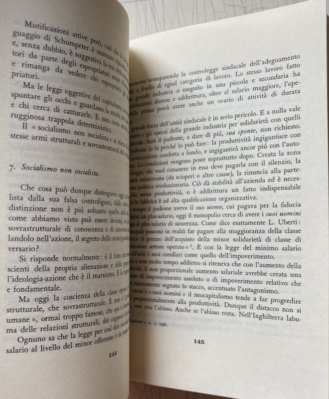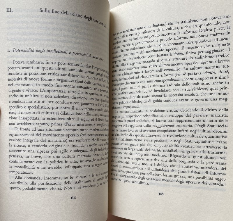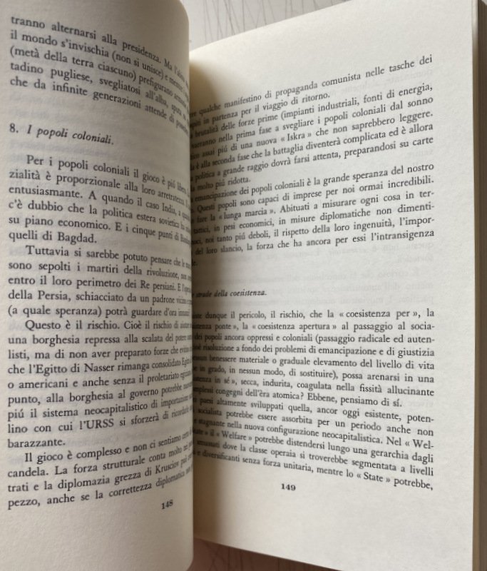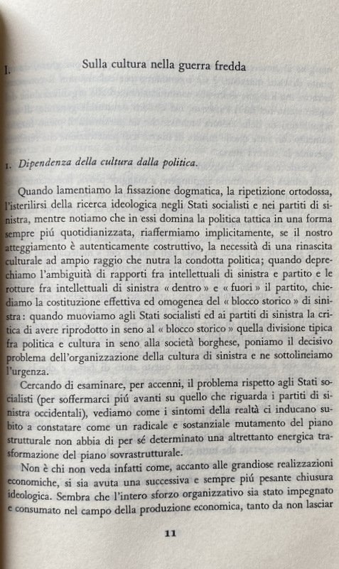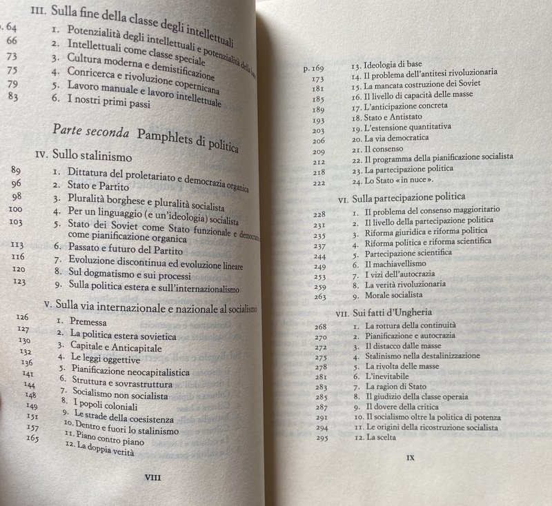 In questo libro emergono le punte polemiche degli anni '50 sul marxismo ortodosso e critico, sulla dittatura del proletariato, sulla guerra fredda e sul disgelo, sullo stalinismo (compreso il saggio scritto per la famosa inchiesta su Nuovi Argomenti, a cui partecipò anche Togliatti), sul problema della fine della classe degli intellettuali, sulle tesi consigliari contrapposte a quelle centralistiche e autoritarie, sulla estinzione dello Stato, sulla partecipazione politica, ecc.