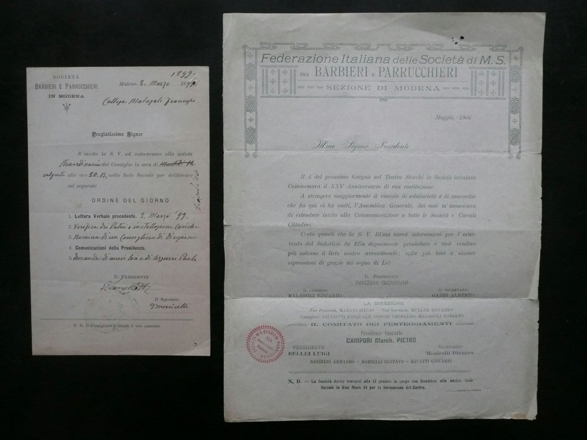 Societ‡ Barbieri Parrucchieri Modena 2 Carte Intestate 1899 1906 Mutuo Soccorso