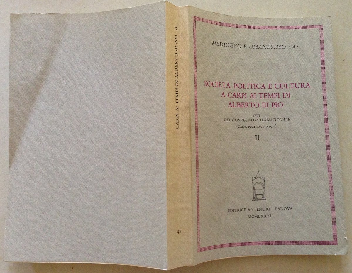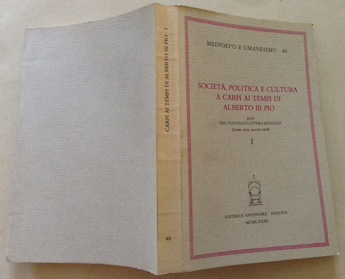 A.A. V.V., Società, politica e cultura a Carpi ai tempi di Alberto III Pio Atti del Convegno Internazionale (Carpi, 19-21 maggio 1978) 2 volumi Editrice Antenore, Padova, 1981; cm. 25x16,5; pp. 759 (numerazione progressiva); 2 volumi; società, politica e cultura a Carpi ai tempi di Alberto III Pio; con tavv. ripiegate; brossure ed. Condizioni di conservazione Esemplari in ottimo stato di conservazione, interni in carta forte intonsi; brossura editoriale posteriore secondo volume con una pieghetta (vedi foto). SETT92.L19648 MT