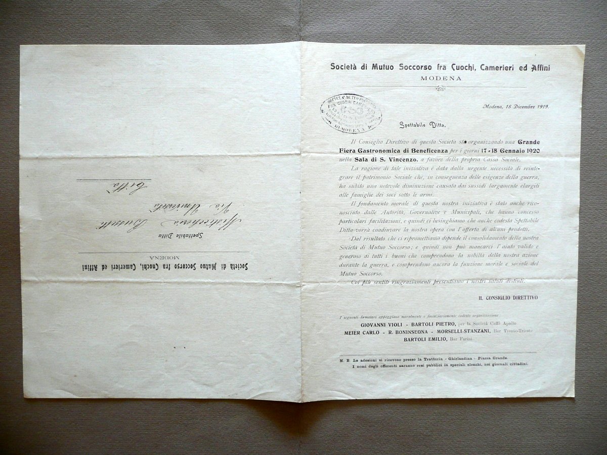 Lettera, Società di Mutuo Soccorso fra Cuochi, Camerieri e Affini Modena Spettabile Ditta, Il Consiglio Direttivo di questa Società sta organizzando una Grande Fiera Gastronomica di Beneficenza per i giorni 17-18 gennaio 1920 nella Sala di S. Vincenzo, a favore della propria Cassa Sociale. [.]" Lettera a stampa su bifolio in carta, datata Modena - 18 dicembre 1919; testo disposto alla prima facciata, all'ultima indirizzo del destinatario apposto a penna nera (vedi foto). Cm 28x22. Condizioni di conservazione Esemplare ben conservato con tracce d'uso, normali tracce di pieghe di spedizione, alcune minuscole bruniture. A firma di Giovanni Violi e Bartoli Pietro del Caffè Apollo, di Carlo Meier - R. Boninsegna - Morselli / Stanzani del Bar Trento - Trieste, di Emilio Bartoli del Bar Farini. Le adesioni a tale fiera erano raccolte presso la trattoria "Ghirlandina" in Piazza Grande. SC03.D13059 N "