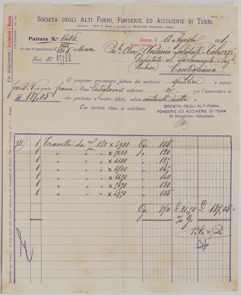 In 8. Dim. cm 26,5x22. Bella fattura del 11 agosto 1911 della "Societa degli alti forni fonderie ed acciaierie" di Terni. Lista del materiale acquistato. In buone condizioni fioriture, piegature. Beautiful invoice of the 18th of august 1911 of the firm "Societa degli alti forni fonderie ed acciaierie" in Terni. In good conditions, foldings.