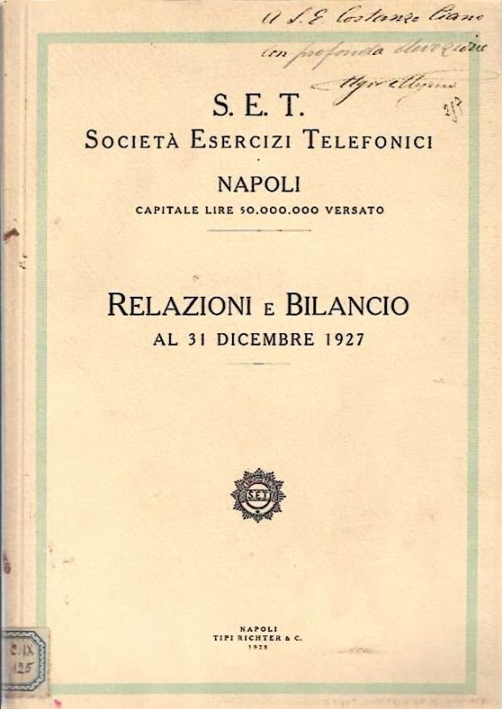 Società Esercizi Telefonici - Napoli. Realazione e Bilancio al 31 Dicembre 1927. Assemblea generale ordinaria - 1928.
