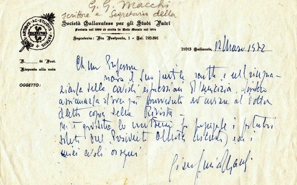 biglietto manoscritto e firmato dal segretario G. G. Macchi su carta intestata "Società Gallaratese per gli Studi Patri" datato Gallarate 1972; buon es