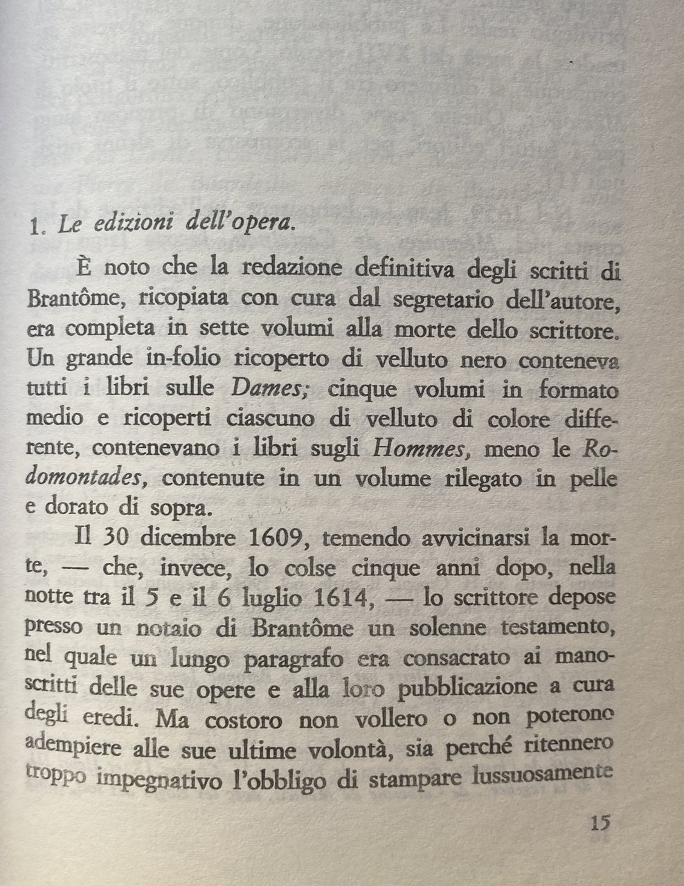 Al ritratto tradizionale e ingannevole di un Brantôme perverso pittore dei costumi dissoluti della corte de' Valois, l'autore propone un ritratto rivalutato e, indubbiamente, più autentico: quello appunto di uno storico militare di primo ordine e di un moralista, che osserva e dipinge la realtà che si presenta ai suoi occhi non per puro gusto di grivoiserie, ma con l'intento di esame e di studio dei comportamenti umani, quali essi siano, in una società che vive una critica fase di trasformazione.