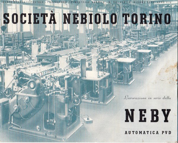 Società Nebiolo Torino. XVII Fiera di Milano, 11,26 aprile 1936. Lavorazione in serie della Neby Automatica PVD. Depliant pubblicitario.