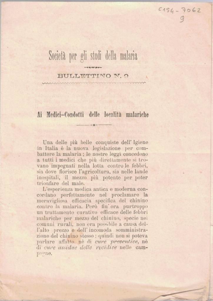 Società per gli studi della malaria, Bollettino n. 9. Ai Medici Condotti delle località malariche