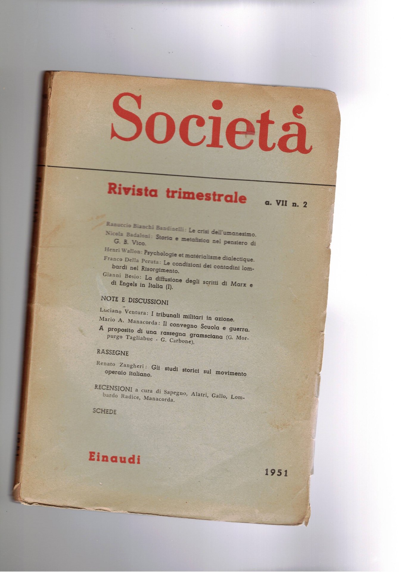Società, rivista trimestrale. Disponiamo del n° 2 del 1951. La crisi dell'umanità di R. B. Baandinelli; le condizioni dei contadini lombardi nel risorgimento di Della Peruta; gli studi storici sul movimento operaio di R. Zangheri; ecc.