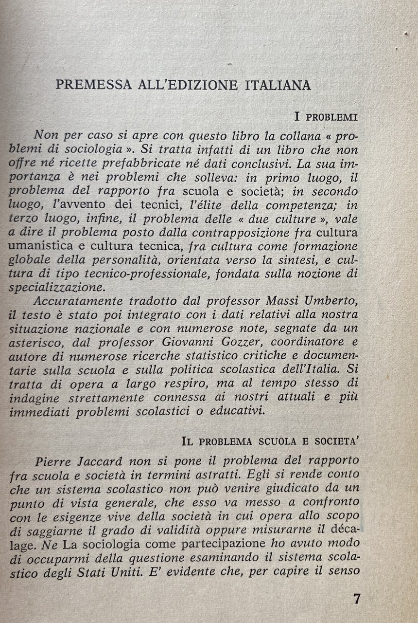 PREMESSA ALL'EDIZIONE ITALIANA. Si tratta di un libro che non offre né ricette prefabbricate né dati conclusivi. La sua importanza è nei problemi che solleva: in primo luogo, il problema del rapporto fra scuola e società; in secondo luogo, l'avvento dei tecnici, l'élite della competenza; in terzo luogo, infine, il problema delle due culture, vale a dire il problema posto dalla contrapposizione fra cultura umanistica e cultura tecnica, fra cultura come formazione globale della personalità, orientata verso la sintesi, e cultura di tipo tecnico-professionale, fondata sulla nozione di specializzazione. Accuratamente tradotto dal professor Massi Umberto, il testo è stato poi integrato con i dati relativi alla situazione italiana e con numerose note, segnate da un asterisco, dal professor Giovanni Gozzer, coordinatore e autore di numerose ricerche statistico critiche e documentarie sulla scuola e sulla politica scolastica dell'Italia. Si tratta di opera a largo respiro, ma al tempo stesso di indagine strettamente connessa ai nostri attuali e più immediati problemi scolastici o educativi. Pierre Jaccard non si pone il problema del rapporto fra scuola e società in termini astratti. Egli si rende conto che un sistema scolastico non può venire giudicato da un punto di vista generale, che esso va messo a confronto con le esigenze vive della società in cui opera allo scopo di saggiarne il grado di validità oppure misurarne il décalage. Ne La sociologia come partecipazione ho avuto modo di occuparmi della questione esaminando il sistema scolastico degli Stati Uniti. È evidente che, per capire il senso del rapporto scuola-società, occorre preliminarmente comprendere la natura e gli orientamenti fondamentali delle società particolari. Compito, arduo, esposto alle insidie delle affermazioni generiche, dei luoghi comuni, oppure, per converso, a quella classica trappola che è la ricerca erudita, minuta, praticamente inesauribile. Jaccard sfugge abilmente a questi pericoli ancorando la propria ricerca ai dati positivi offerti dagli sbocchi professionali dell'istruzione. Egli ritiene infatti che una delle cause maggiori dello squilibrio del nostro mondo industriale si manifesta appunto nel tipo di preparazione offerto ai giovani dalle scuole attuali, un tipo di preparazione che è responsabile della situazione paradossale in cui tale mondo industriale viene a trovarsi nella maggior parte dei paesi tecnicamente avanzati, minacciato da situazioni contraddittorie di disoccupazione e di scarsità di lavoratori. La documentazione, specialmente per quanto riguarda i paesi europei, è a questo riguardo impressionante. Le società scivolano ormai, con un ritmo sempre più veloce, verso la terziarizzazione delle loro strutture, quindi denunciano un bisogno crescente di specialisti e di tecnici, mentre i sistemi scolastici attualmente vigenti, fermi e legati ad antichi modelli, continuano a fornire al mercato del lavoro una manodopera genericamente formata oppure membri delle tradizionali professioni liberali per i quali si faranno aspettare i clienti, oppure ancora operai monovalenti in base ad una concezione restrittiva ed esclusivistica, sostanzialmente artigiana, del mestiere. A questo riguardo, l'analisi di Jaccard raggiunge in più d'un punto l'eloquenza d'una grande denuncia. Se un appunto critico si può muovere, esso riguarda una certa insensibilità quanto alla complessità obbiettiva del problema. Il rapporto scuola-società è un rapporto a due vie. Non è sufficiente descrivere accuratamente e documentare lo scarto fra bisogni del mercato e produzione del sistema scolastico per ottenere un rapido, preciso riequilibramento. Il sistema del prezzo culturale non è ancora stato inventato. Occorre sempre tener presente che ogni società ha una duplice esigenza: di conservazione e di progresso, di consolidamento e di innovazione. La scuola, insieme con le altre istituzioni, deve far fronte a tale duplice esigenza che, nei momenti di rapide trasformazioni strutturali, può manifestarsi come una vera e propria contraddizione. ...
