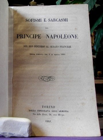 2 articoli in un fascicolo in 8, brossura muta, sguardia, frontespizio, 36, 46 pp., bianca finale. Riassunto del discorso di Napoleone riguardante il suo dominio nella terra Piemontese e la svestizione papale. Legato con: LE DUE POLITICHE DELLA FRANCIA E LA DIVISIONE DI ROMA di Paolo Sauzet dove l'Autore descrive la situazione politica papale, che da un lato ha avuto il consenso napoleonico, ma dall'altra, con il non intervento si trovava nell'unica soluzione dell'esilio. Brunitura e sporadica fioritura della carta, in buono stato, interessante, poco comune.
