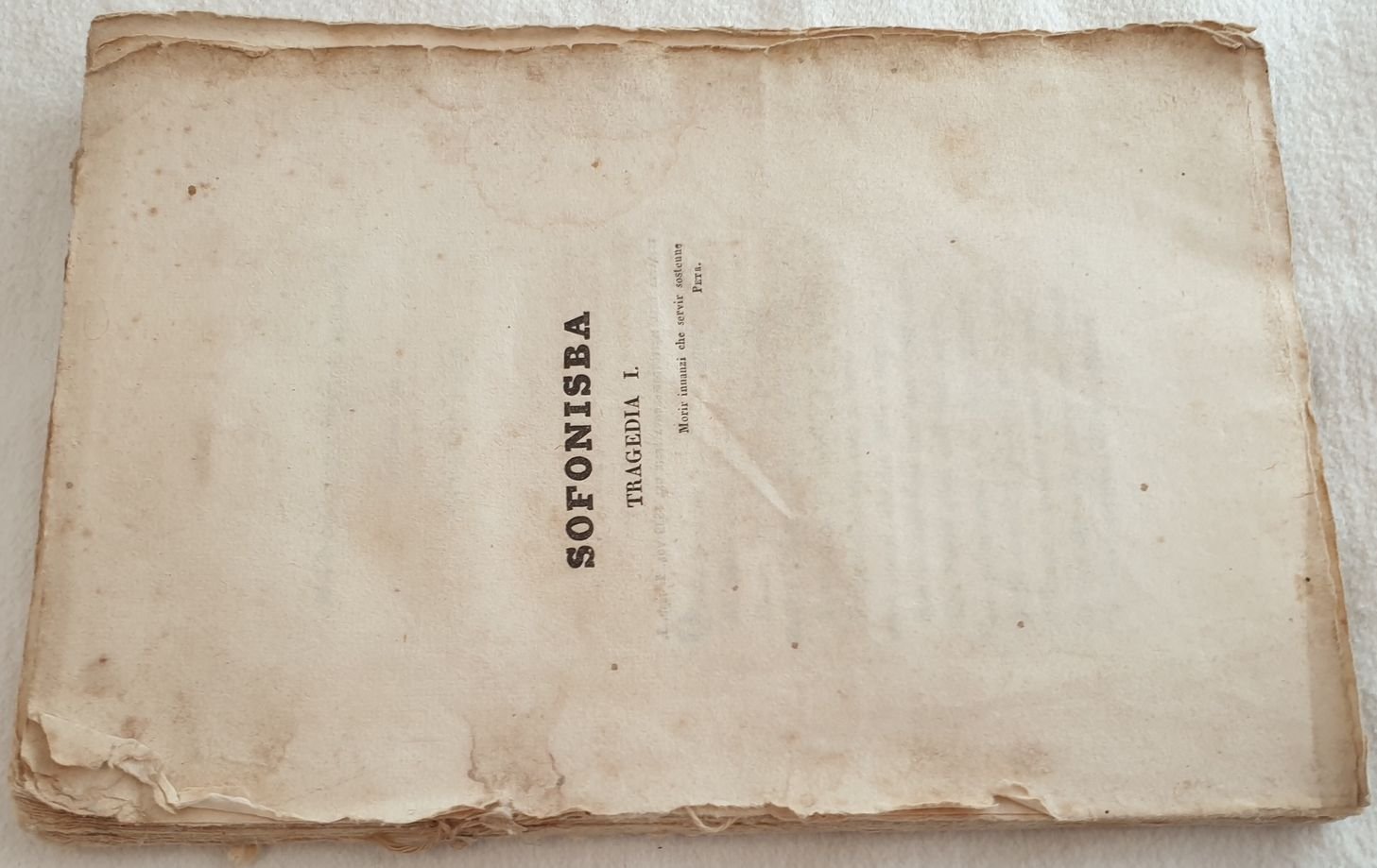 Edizione del 1839 della tragedia "Sofonisba" di Edoardo Fabri. Estratto dall'Istitutore Nuova serie del 1839 vol. I, disp. 1. Frontespizio editorialmente assente. In discrete condizioni. Copertina assente. Legatura quasi assente. All'interno le pagine si presentano in discrete condizioni con fioriture. Gore d'umidità marginali. In 8. Dim. 22,5x15 cm. Pp. VII+74+(1).Edition of 1839 of the tragedy "Sofonisba" by Edoardo Fabri. Extract from Istitutore Nuova serie del 1839 vol. I, disp. 1. Title page is editoriarly missing. In fair conditions. Cover is missing. Binding is almost missing. Inside pages are in fair conditions with foxings. Dump stains. In 8. Dim. 22,5x15 cm. Pp. VII+74+(1).
