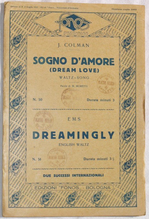 In 8. cm 27x18. pp. 26. partitura completa per orchestra del 1931 di due canzoni. Caratteristica copertina illustrata da Cominim. Ex libris sulla copertina ed in qualche pagina. Ottime condizioni. a complete score for orchestra of 1931. Carachteristic decorated cover of that period. Ex libris in the cover and in some pages. Very good conditions.