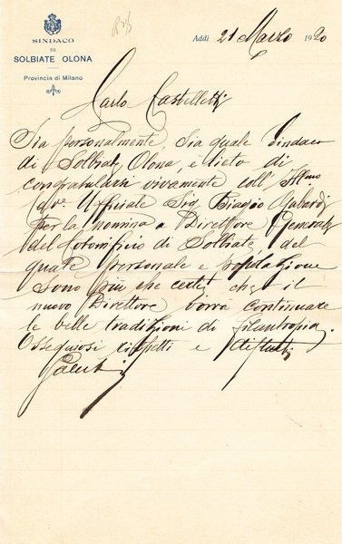 lettera manoscritta e firmata del Sindaco di Solbiate Olona di 1 facciata su carta intestata "Sindaco di Solbiate Olona" datata 21 Marzo 1920; ottimo es.