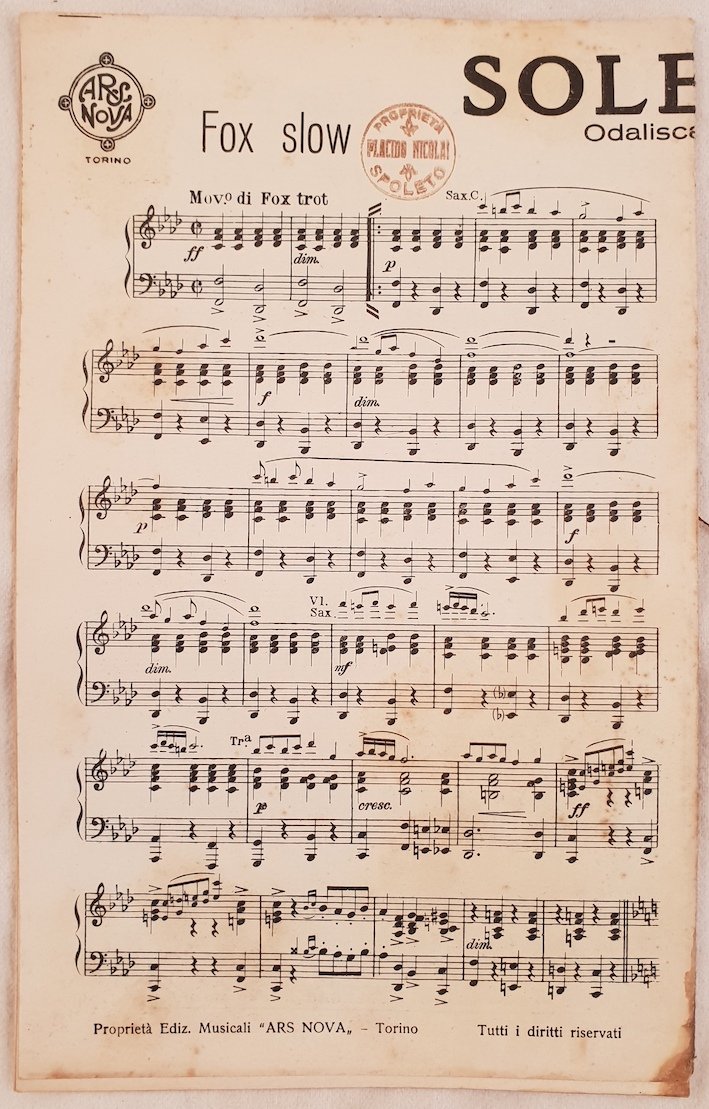Bello spartito, partitura completa per orchestra senza data ma degli anni '30 di due canzoni di Leo Pant.<BR>Copertina mancante. GENERE: Fox slow e fox trot<BR>STRUMENTI: pianoforte, violino, violoncello, contrabasso, clarino/clarinetto, flauto, sassofono, batteria, trombe, trombone ANNO: anni '30 DIMENSIONI: In 8. cm 27,5x17,5<BR>PAGINE: 26 CONDIZIONI: In buone condizioni<BR>NOTE: Ex libris alla prima pagina Beautiful score of two songs, a complete score for orchestra of 1930's of two songs of Leo Pant. Cover is missing MUSIC: Fox slow e fox trot STRUMENTI: piano; violin; violoncello; contrabbass; clarion/clarinet, flute, saxophone, drums, trumpet, trombone YEAR: 1930's SIZE: In 8. cm 27,5x17,5 PAGES: 26 CONDITIONS: In good conditions nOTES: Ex libris in the pages