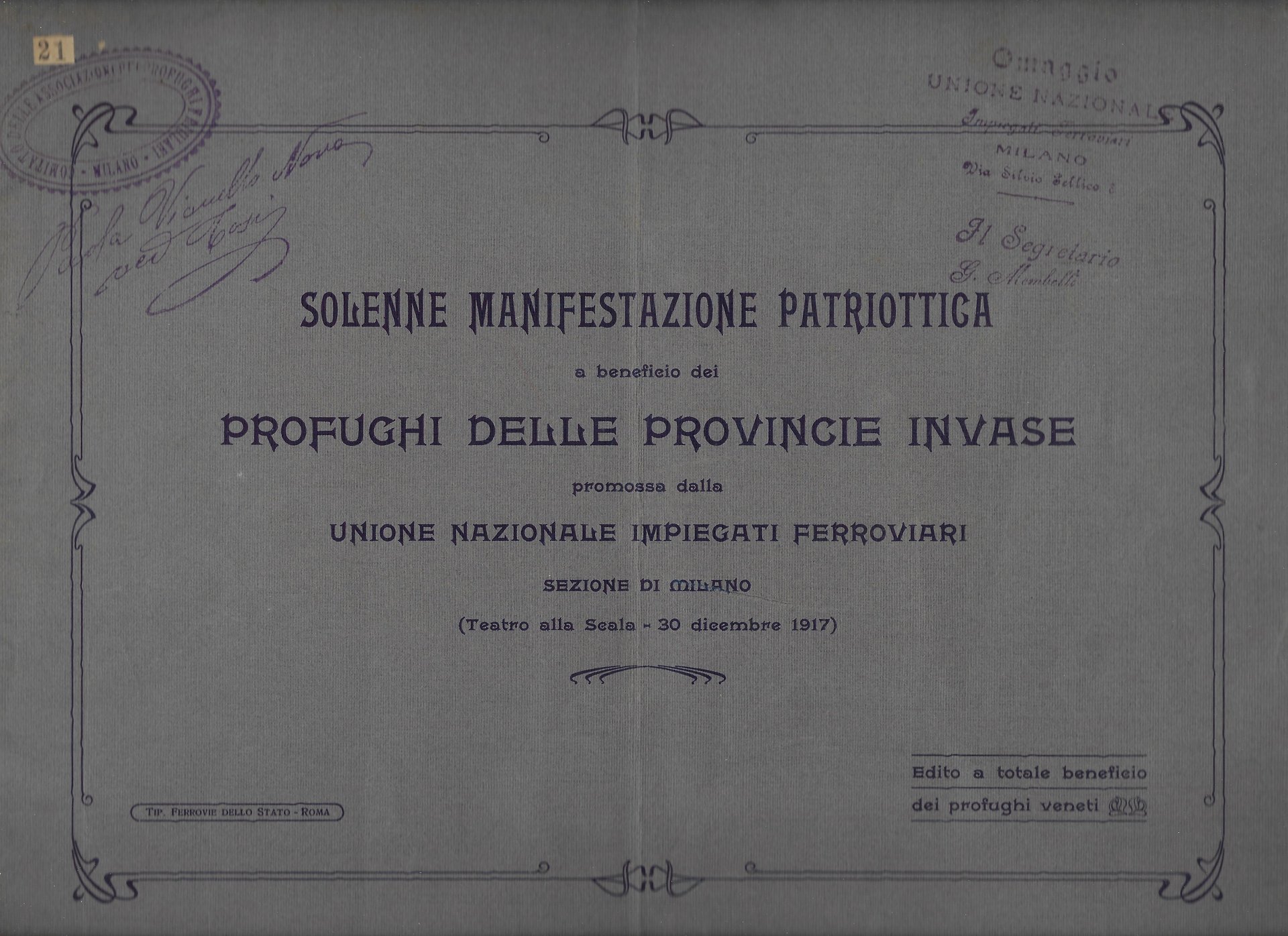 Solenne manifestazione patriottica a beneficio dei profughi delle provincie invase promossa dalla Unione Nazionale Impiegati Ferroviari. Sezione di Milano
