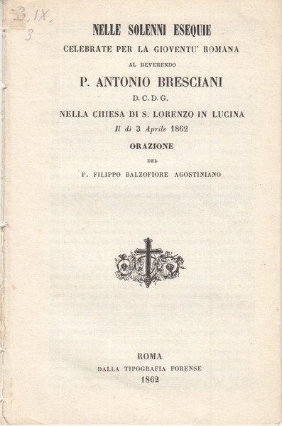 Solenni Esequie Celebrate Per La Gioventù Romana Al Reverendo P. Antonio Bresciani