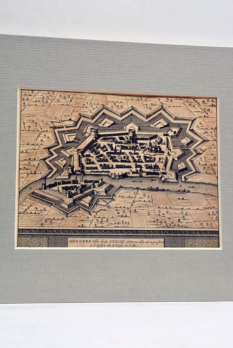 15,5x18,5 Cm. Gravure sur cuivre en bon état. Encadrement passe partout. Ouvrage source L'état et les délices de la Suisse, 1730, 75 illustrations. Vue de la ville de Soleure.