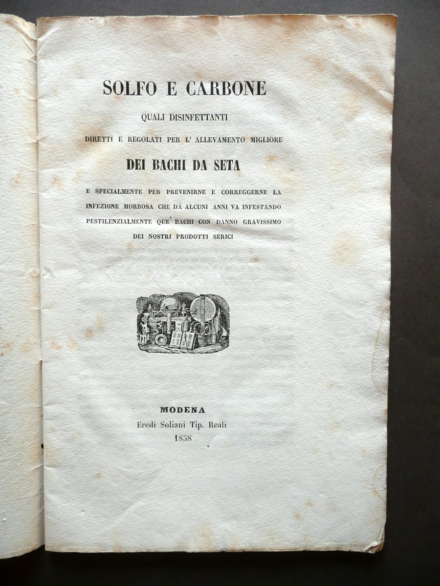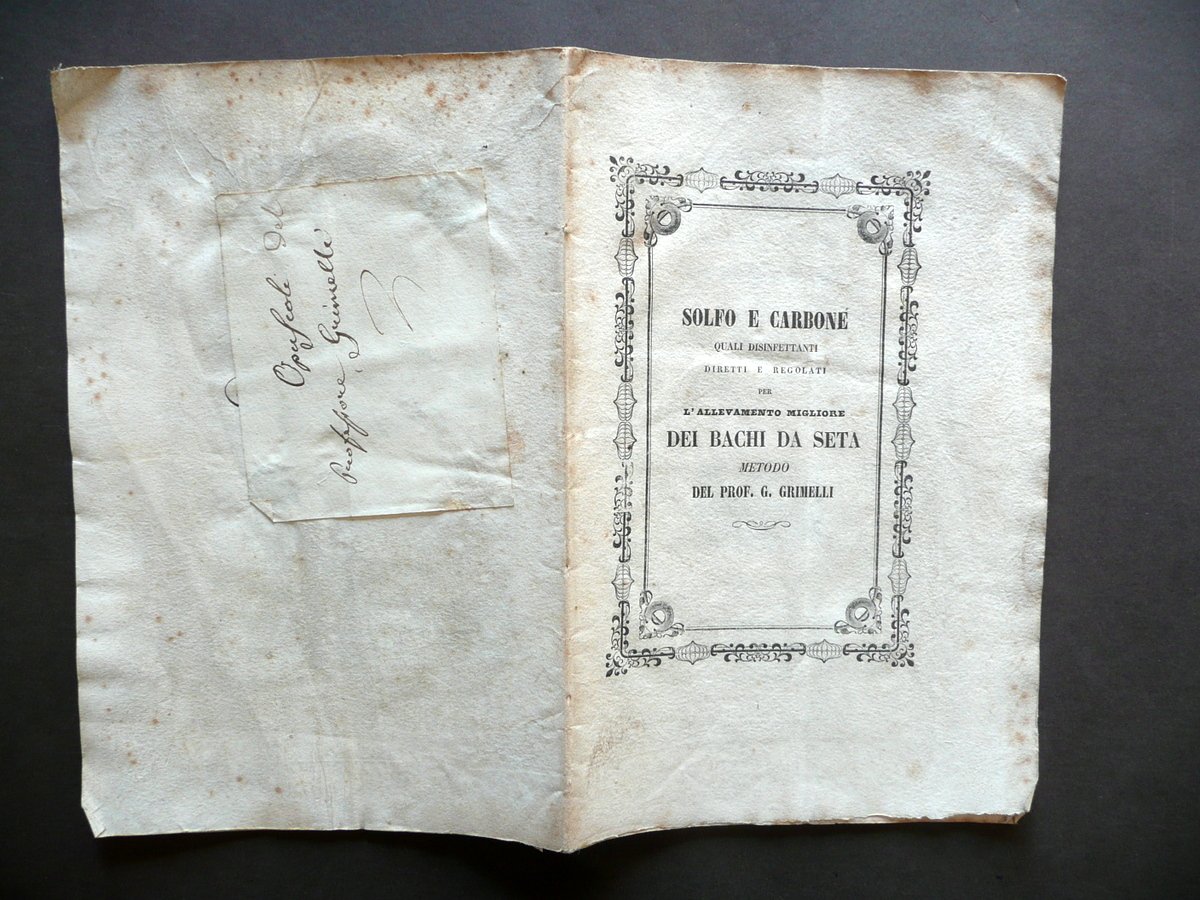 Prof. G. Grimelli, Solfo e Carbone quali disinfettanti diretti e regolati per l'allevamento migliore dei Bachi da Seta e specialmente per prevenirne e correggerne la infezione morbosa che da alcuni anni va infestando pestilenzialmente que' bachi con danno gravissimo dei nostri prodotti serici Metodo del Prof. G. Grimelli Eredi Soliani Tipografi Reali, Modena 1858, cm 22,5x14,5, pp. 28; brossura ed. d'attesa. Brossura post. con applicato vecchio foglio manoscritto (vedi foto). Condizioni di conservazione Esemplare in buone condizioni con tracce d'uso e del tempo; alcune piccole leggere bruniture e lievi tracce di sporco, queste ultime prevalentemente alle brossure; alcuni angoli con una minima pieghetta; margine est. della brossura ant. e delle prime 10 pagine con un paio di piccole leggerissime ombre di gore che non interessano il testo. OPEB.2834 N