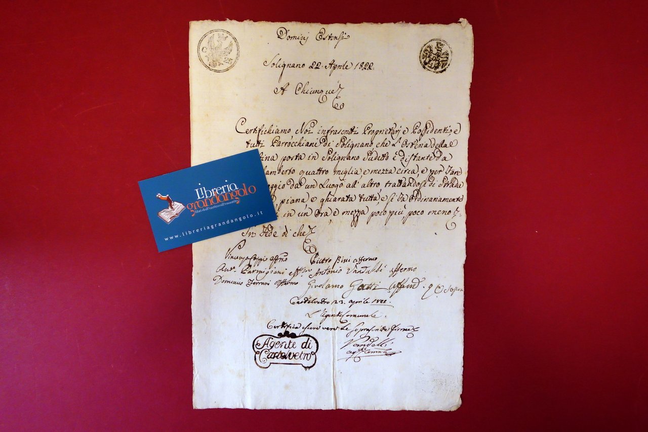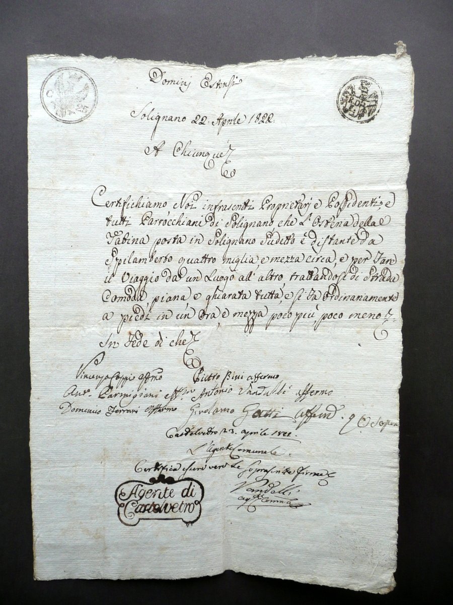 Attestato di distanza interamente manoscritto su foglio in carta, datato Solignano, 22 aprile 1822; testo disposto ad un'unica facciata, con presenza di firme alla parte inf. e di alcuni timbri che ne certificano la validità (vedi foto). Cm 27x19.