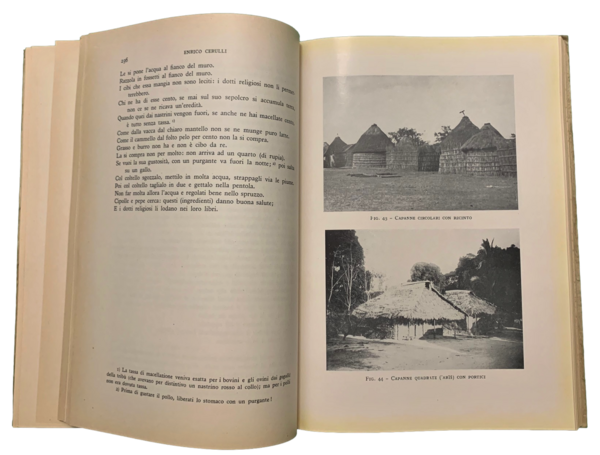 In 4° (24,2x16,8 cm); (10), 392, (2) pp. e 60 c. di tav., varie a colori. Brossura editoriale con titolo impresso in rosso e nero al piatto anteriore. Prima edizione del secondo volume di questo che rappresenta uno degli studi più ampi sul territorio somalo scritti fino ad allora. L'opera, composta di tre volumi, uscì a più riprese, fra il 1957 ed il 1964. Il volume è una delle opere principali del noto diplomatico e linguista italiano, Enrico Cerulli (Napoli, 15 febbraio 1898 Roma, 19 settembre 1988), specializzato in lingue semitiche. Cerulli è celebre anche per le traduzioni in latino e antico francese del Kitab al-Mi?raj (Libro del Mi?raj), famoso testo islamico in arabo, concernente l'ascesa al cielo di Maometto dalla Mecca a Gerusalemme e il suo viaggio in una sola notte che influenzò anche la Divina Commedia di Dante. Tra il 1939 ed il 1940 fu mandato dal governo italiano, nel corno d'Africa per ricoprire la carica di funzionario coloniale, divenendo governatore dello Scioa e dell'Harar. Alla fine della Seconda Guerra Mondiale il restaurato governo somalo, chiese all'ONU che Cerulli venisse consegnato per essere incriminato come criminale di guerra ma venne solo sentito come testimone per il periodo della dominazione fascista. In seguito il governo somalo lasciò cadere la condanna ma stabilì l'espulsione definitiva di Cerulli dal proprio territorio nonostante gli enormi contributi di Cerulli per la conoscenza della storia e della cultura somala, contributo, riconosciuto dagli stessi studiosi somali che si avvalsero, ampiamente, dei testi di Cerulli. Esemplare in buone-ottime condizioni di conservazione. Molto raro.