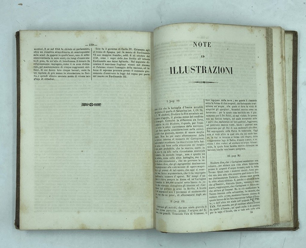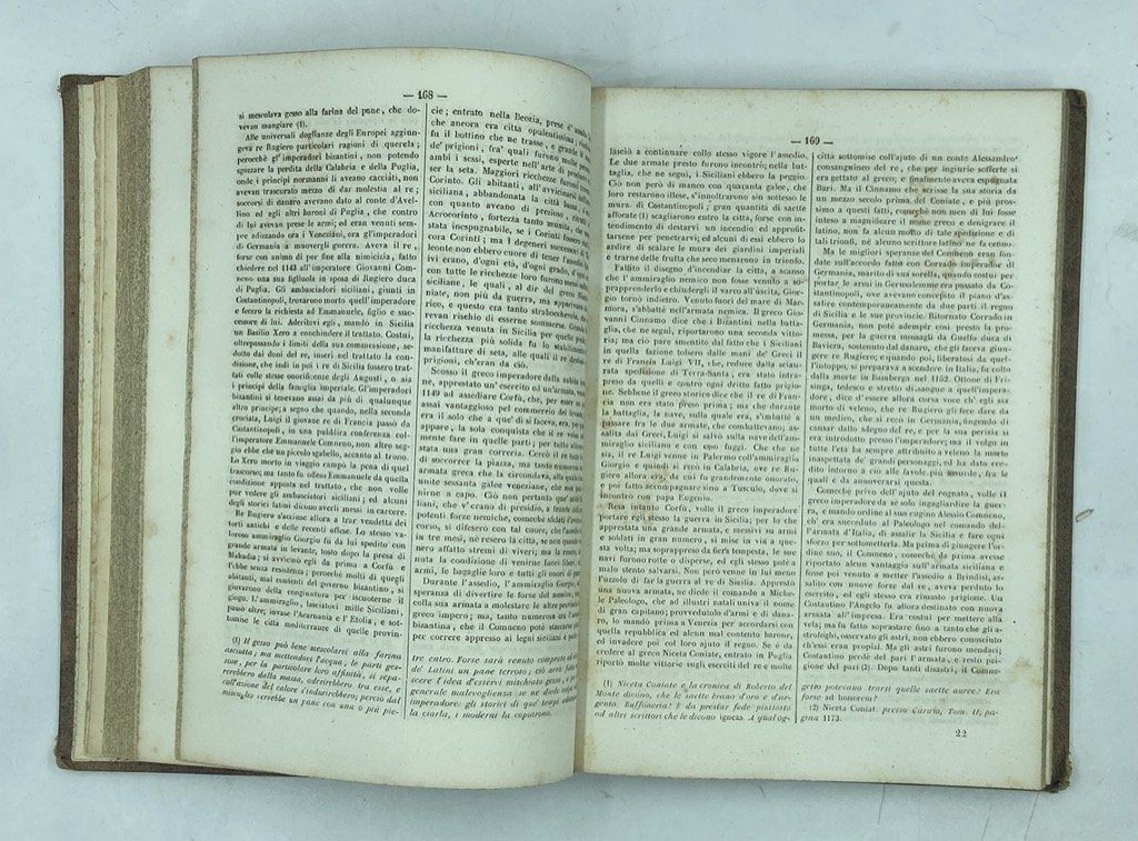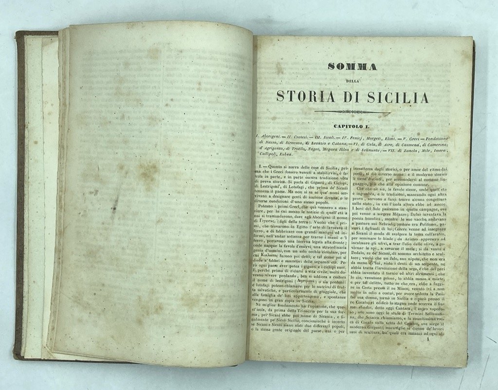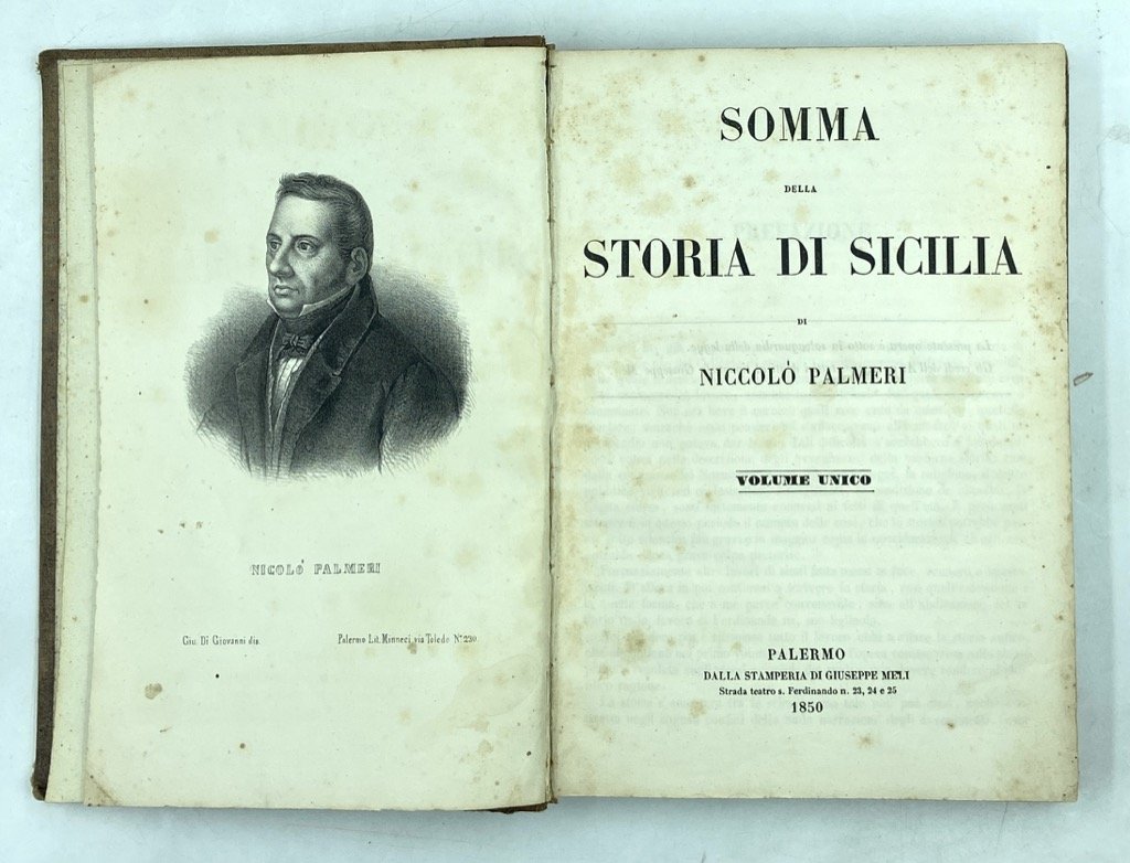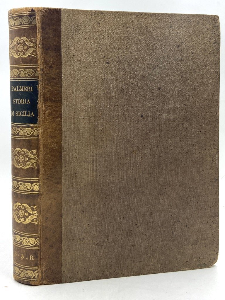 Legatura coeva in mezza pelle con piatti in tela zigrinata, sul dorso fregi dorati e titoli su tassello, sguardie bianche in carta vergata e filigranata, in quarto cm 24 x 17, pp X 475 VIII, ritratto all'antiporta, testo su due colonne, errata al verso dell'ultima carta di indice. Esemplare genuino e complessivamente ben conservato, sparse bruniture e arrossamenti specie sulle prime e ultime carte, leggermente rifilata sul margine esterno l'antiporta (presumibilmente dal legatore), lievi aloni e tracce d'uso sulla coperta. Prima edizione in volume unico della storia siciliana di Niccolò Palmeri, economista e uomo politico, fautore dell'indipendenza dell'isola e della Costituzione del 1812. Lo studioso lavorò all'opera dal 1825, parallelamente al «Saggio sulle cause e i rimedi delle angustie attuali dell’economia agraria in Sicilia» pubblicato l'anno seguente, e più intensamente a partire dal 1830, esprimendo una posizione più conciliante con la monarchia Borbonica rispetto al Saggio e mitigando la visione sicilianista con «una nuova sensibilità nei confronti dei comuni interessi dell’Italia» (Fazio, DBI). Palmeri poté pubblicare i primi due volumi dell'opera nel 1834 e 1835 a Palermo; la progettata pubblicazione dei restanti tre tomi, nel 1837, fu impedita dalla penuria di carta e in ultimo dalla morte dell'autore per il colera scoppiato all'inizio dell'estate di quell'anno. Tra il 1838 e il 1840 uscirono, postumi, i rimanenti volumi, e nel 1850 l'editore palermitano Giuseppe Meli diede alle stampe questa edizione in unico tomo, corredata di un Elogio dell'autore, scritto da Francesco Perez, e da alcune Note ed illustrazioni dello storico siciliano Pietro Sanfilippo (vedi la bibliografia nell'edizione delle Opere curata da Carlo Somma del 1883); il ritratto dell'autore all'antiporta, su disegno di Giuseppe di Giovanni, è impresso dalla Litografia Minneci. Narbone, Bibliografia Sicola Sistematica, IV, p. 354; Somma, Opere 1883, p. XXVIII (come Narbone data l'opera al 1851); Mira, Bibliografia Siciliana III, p. 171, cita l'edizione originale e quella del 1883 ma ignora questa.