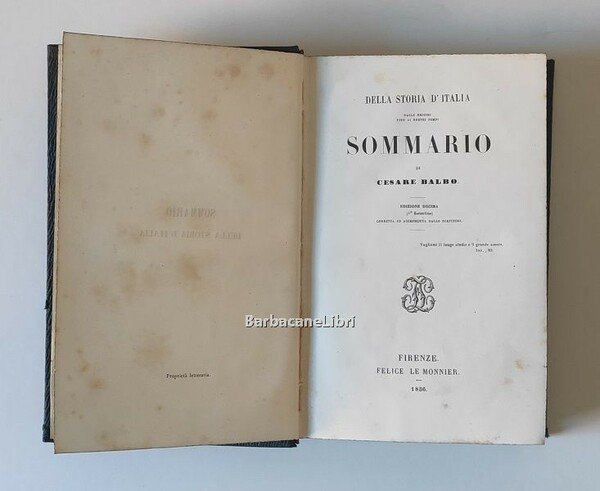 Stato di conservazione: OTTIMO, qualche fioritura, legatura solida e compatta, nessun segno o scritta all'interno. Bella edizione del Sommario della storia d'Italia apparso per la prima volta nel 1846. La copia proposta è la decima edizione (prima fiorentina) corretta ed accresciuta dallo scrittore, stampata nel 1856.