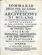 Sommario delle Vite, ed Azioni degli Arcivescovi di Milano da S. Barnaba sino al governo presente. Istoria sacra agli Illustrissimi Signori Vicario, Sessanta Decurioni, e XII del Tribunale di Provisione dell'Inclita Città, e Ducato di Milano