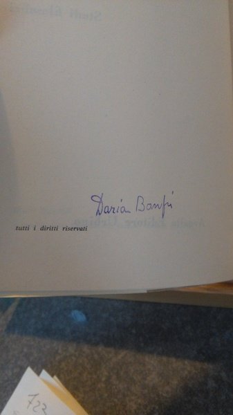 Brossura in generale buonissimo stato, dorso con leggere pieghe e piatti con tracce di scaffali. Pagine brunite ma senza scritte o sottolineature, fatta eccezione per firma di possesso da parte della moglie.