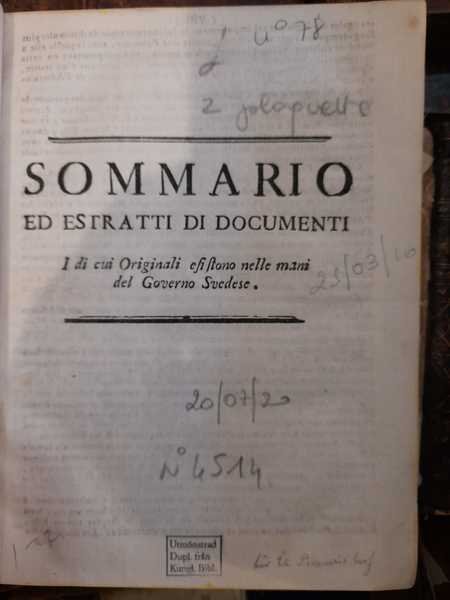 Sommario ed estratti di documenti i di cui originali esistono nelle mani del governo svedese