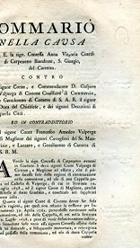 Sommario nella causa di S. E. la sign. Contessa Anna Vittoria Coardi di Carpenetto Biandrate, S. Giorgio, del Carretto. Contro il signor Conte, e Commendatore D. Gaspare Valperga di Civrone Consiliere di Commercio, e Gentiluomo di Camera di S. A. R. il signor Duca del Chiablese, e dei signori Decurioni di questa città. Ed in contraddittorio del signor Conte Francesco Amedeo Valperga di Maglione dei signori Cavaglieri dei SS. Maurizio, e Lazzaro, Gentiluomo di Camera di S. R. M.