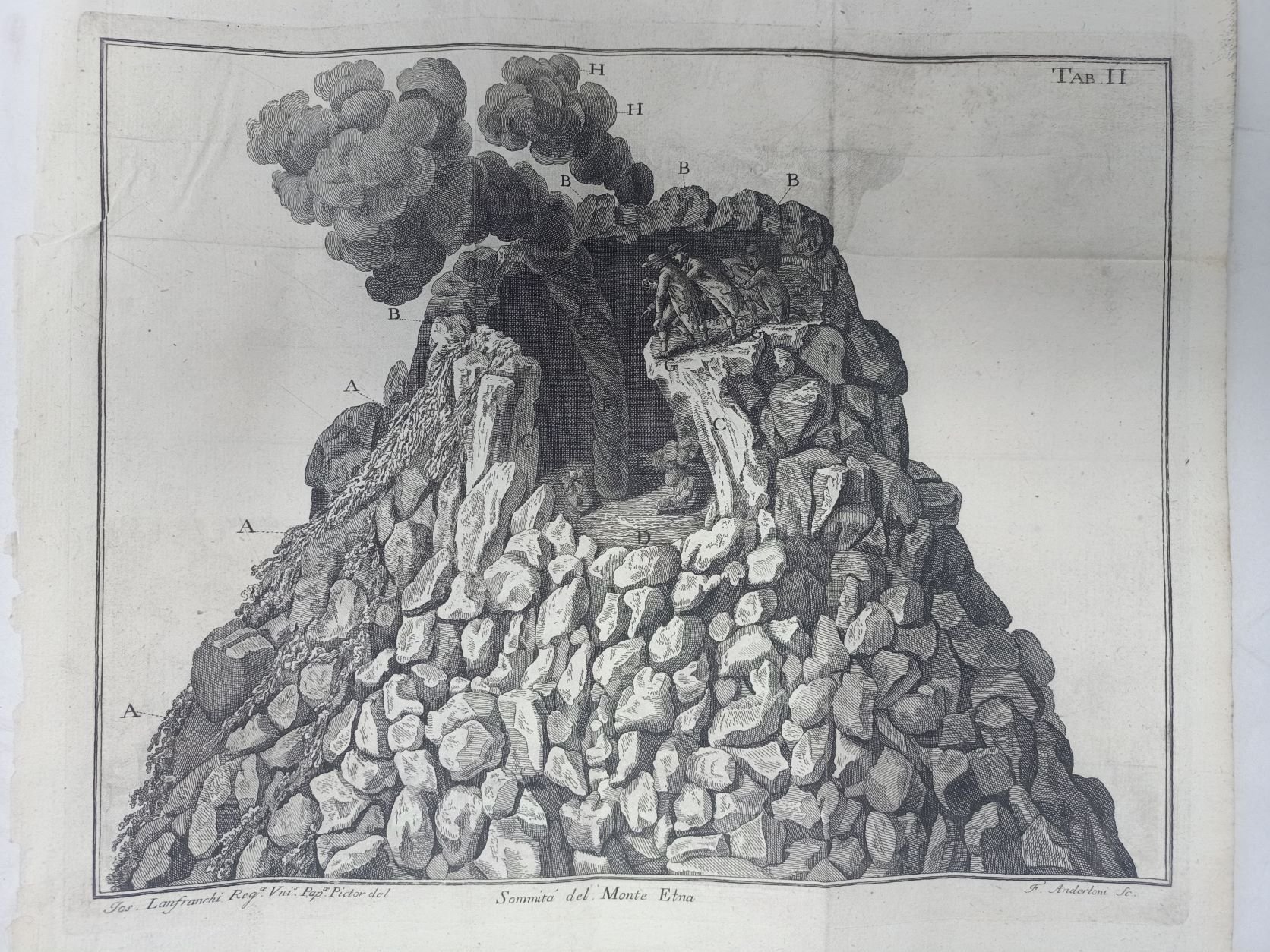 >Incisione in rame (mm 234x289) con margini, tratta da "Viaggio alle due Sicilie e in alcune parti dell'Appennino" di Lazzaro Spallanzani, opera in sei volumi (Pavia, 1792-1797). Veduta del vulcano, sulla sommità studiosi all'opera. Tavola II. Bella incisione, ottimamente conservata.