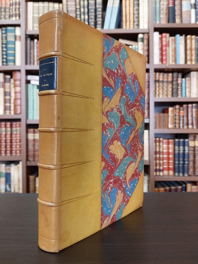 In-8° (cm. 26,5), raffinata legatura coeva in mezza pelle nocciola ad angoli, dorso a nervi con titolo in oro su tassello blu, filetti e fregi impressi a secco, piatti e risguardi marmorizzati, taglio superiore dorato, conservata la brossura originale a stampa illustrata a colori; pp. [6] XII 312 [4] in barbe, in ottimo stato; 12 tavole fuori testo incise a colori di grandi artisti dell'epoca; numerose incisioni in nero nel testo. Graziosi capilettera e finalini figurati. Vignetta incisa in rame al centro del frontespizio con titoli in rosso e nero. Prima rara edizione illustrata. «Ouvrage documentaire du plus vif intérêt» [Carteret IV, 384]. Ex libris araldico applicato al contropiatto. Superbo esemplare conservato in custodia marmorizzata con interno in velluto. (NX)