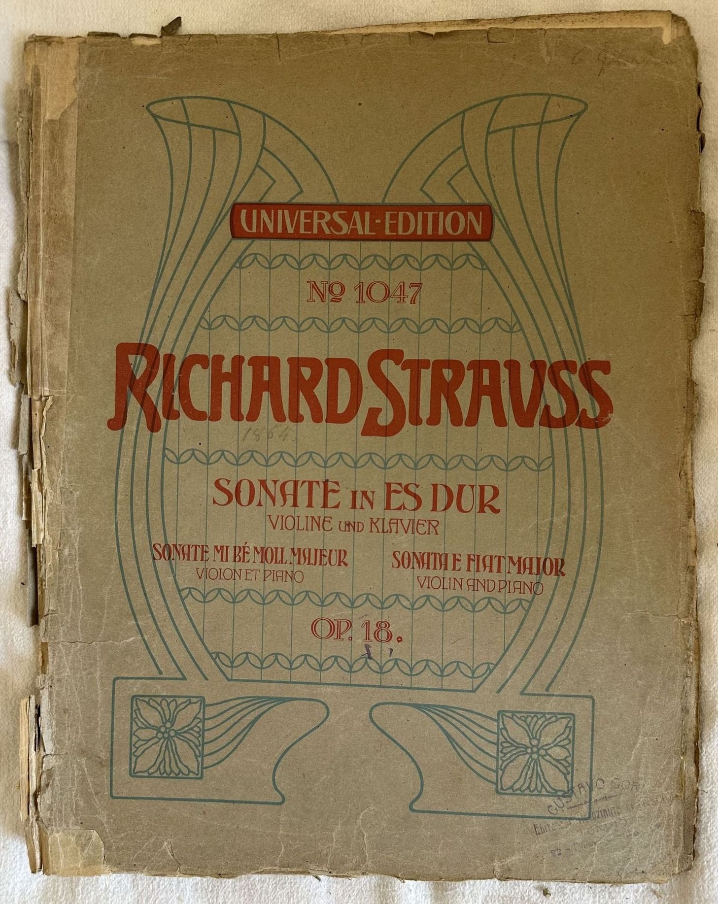 Edizione dei primi del novecento della partitura per melodia "Sonate Es Dur" per pianoforte dall'opera 18 di Richard Strauss. Partitura per pianoforte e violino. Copertina editoriale in mediocri condizioni con usure e mancanze ai margini. Piatti quasi del tutto staccati. Legatura in buone condizioni. Pagine in buone condizioni con fioriture. <BR> Formato cm. 32x24,5. Pp. 51, 8. Edition of early 20th century of the musical score of the melody "Sonate Es Dur" from the opera 18 Richard Strauss.<BR>Score for piano and violin. Editorial cover in poor condittions with wearings and lackings in the edges. Plates almost totally detached. Binding in good conditions. Pages in good conditions with foxing.<BR>Size cm. 32x24,5. Pp. 51, 8.