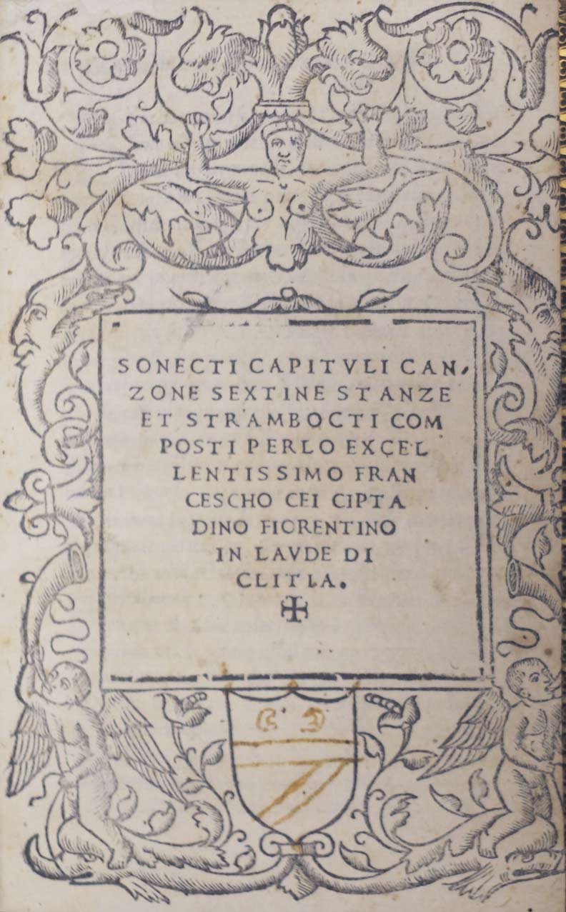 SONECTI CAPITULI CANZONE SEXTINE STANZE ET STRAMBOCTI COMPOSTI PER LO EXCELLENTISSIMO FRANCESCHO CEI CIPTADINO FIORENTINO IN LAUDE DI CLITIA.