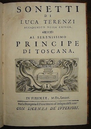 4to (cm. 21,8), 3 cc.nn., 84 pp. Frontis. con incisione del simbolo dell’Accademia della Crusca, capilettera e fregi n.t. Cartonato moderno con motivi floreali. Buon esemplare. Edizione originale. Moreni II, p. 390.