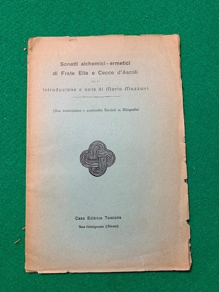 In 8°; 39, (1) pp. Con due fotoincisioni e quattordici simboli in xilografia. Brossura editoriale con xilografia al piatto superiore. Una piccolissima mancanza all'angolo alto interno del piatto anteriore e per il resto in buono-ottimo stato di conservazione. Introduzione e note di Mario Mazzoni. Prima pubblicazione di 6 sonetti, di epoca medievale, tratti dal codice Riccardiano N. 946 della Biblioteca Laurenziana di Firenze a carattere alchemico ed ermetico. Per esplicita ammissione del curatore non vi sono prove documentali che possano darci precise indicazioni sugli autori di questi sei sonetti. Stampato a Città della Pieve dalla Tip. Dante. Rara opera alchemica.