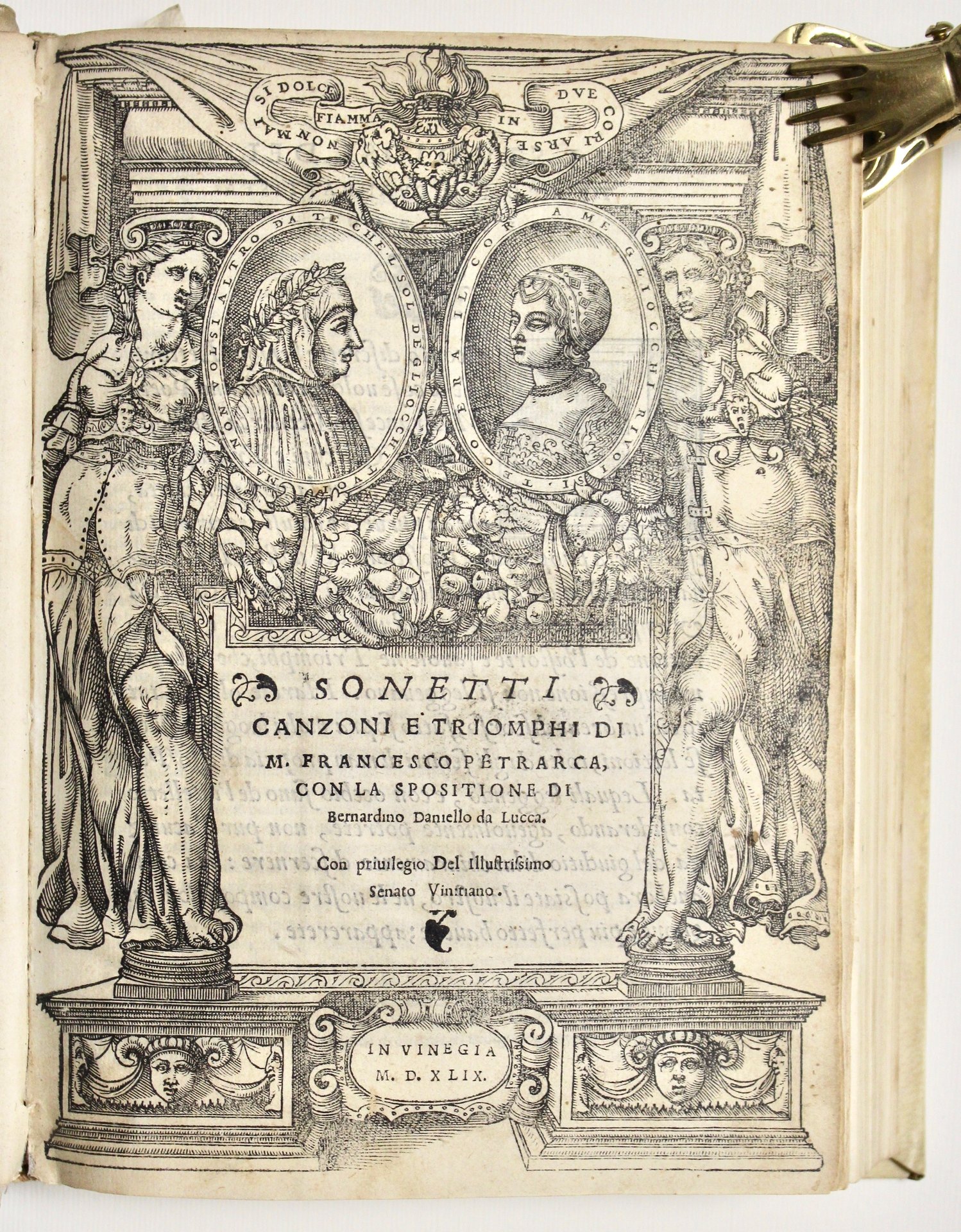 In 8°, (mm 205x145); carte non num. 12, carte 237 con bel frontespizio silografico allegorico raffigurante Petrarca e Laura, numerose iniziali ornate, 6 silografie a mezza pagina, n.n. 3. Legatura in pergamena del XVII secolo con titolo "Petrarca del Daniello" manoscritto al dorso, ex-libris del Conte Sanminiatelli al contropiatto e nota di possesso al foglio di guardia. <BR>Edizione molto corretta e con un testo molto puro (Graesse, V, 227). Si tratta della seconda edizione, con il commento di Daniello tratto dalle note di Trifone Gabriele, molto ampliata e prima edizione illustrata con il medesimo commento con le sei xilografie per i Trionfi. L'edizione del 1549 "è più bella e più minuziosa della precedente". (Brunet, IV, 550) "Fu fatta con molta diligenza, e nitidezza di caratteri; e graziose pur sono le stampe d'intaglio, che adornano i Trioni". (Marsand, Biblioteca petrarchesca, pp. 57-58). Le poesie sono precedute da un'epistola dedicatoria di Daniello Bernardino (1500-1565 circa), ardente difensore dell'arte poetica nel dibattito tra questa e la filosofia. Nato a Lucca, Bernardino fu discepolo dell'umanista Trifone Gabriel a Padova e poi a Venezia. È conosciuto soprattutto per le sue opere su Dante e Petrarca, oltre che per il suo famoso Della poetica (1536). (Dionisotti, "Bernardino Daniello", "Enciclopedia dantesca", 1970, II, pp. 303-304). Lo stesso libraio, Giovanniantonio Nicolini da Sabbio, pubblicò nello stesso anno tre edizioni dei tre commenti, una di Vellutello (datata gennaio), una di Daniello (in marzo) e una di Gesualdo; altre quattro edizioni delle Rime furono pubblicate nello stesso periodo da librai veneziani, a testimonianza dello straordinario successo che la lirica petrarchesca e i commenti che la leggevano riscuotevano all'epoca.<BR>Ottimo esemplare, piccolo rinforzo al verso del piede del frontespizio, piccola macchia al margine sup. delle pagine 160/163, lieve alone al marg. esterno dalla carta 233 alla fine. Speck 254.<BR>