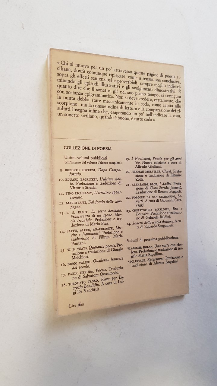 Collezione di Poesia, 24. Prima edizione.<BR>In 16°; pp. 79; brossura editoriale; cucito.<BR>CONDIZOINI DISCRETE, con una piegatura e uno strappettino al piatto anteriore della copertina; copertina ingiallita come spesso accade in questa collana.