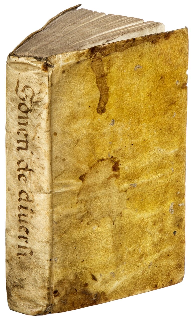 In 8vo (mm. 156x94). Cc. [4], 148. Segnatura: AA4 a-s8 t4. Carattere tondo e corsivo. Marca giuntina sul titolo e al verso dell'ultima carta. Errata alle cc. t3v e t4r. Colophon e registro alla c. t4r. Pergamena coeva con titolo manoscritto al dorso (qualche macchia e lieve mancanza). Sul risguardo anteriore firma di appartenenza di Michele Angelo Guinetti. Macchia al margine inferiore del titolo, aloni marginali, piccola mancanza all'angolo inferiore esterno della c. 131 con minima perdita di testo. Nel complesso ottima copia, estremamente genuina e nella sua prima legatura.