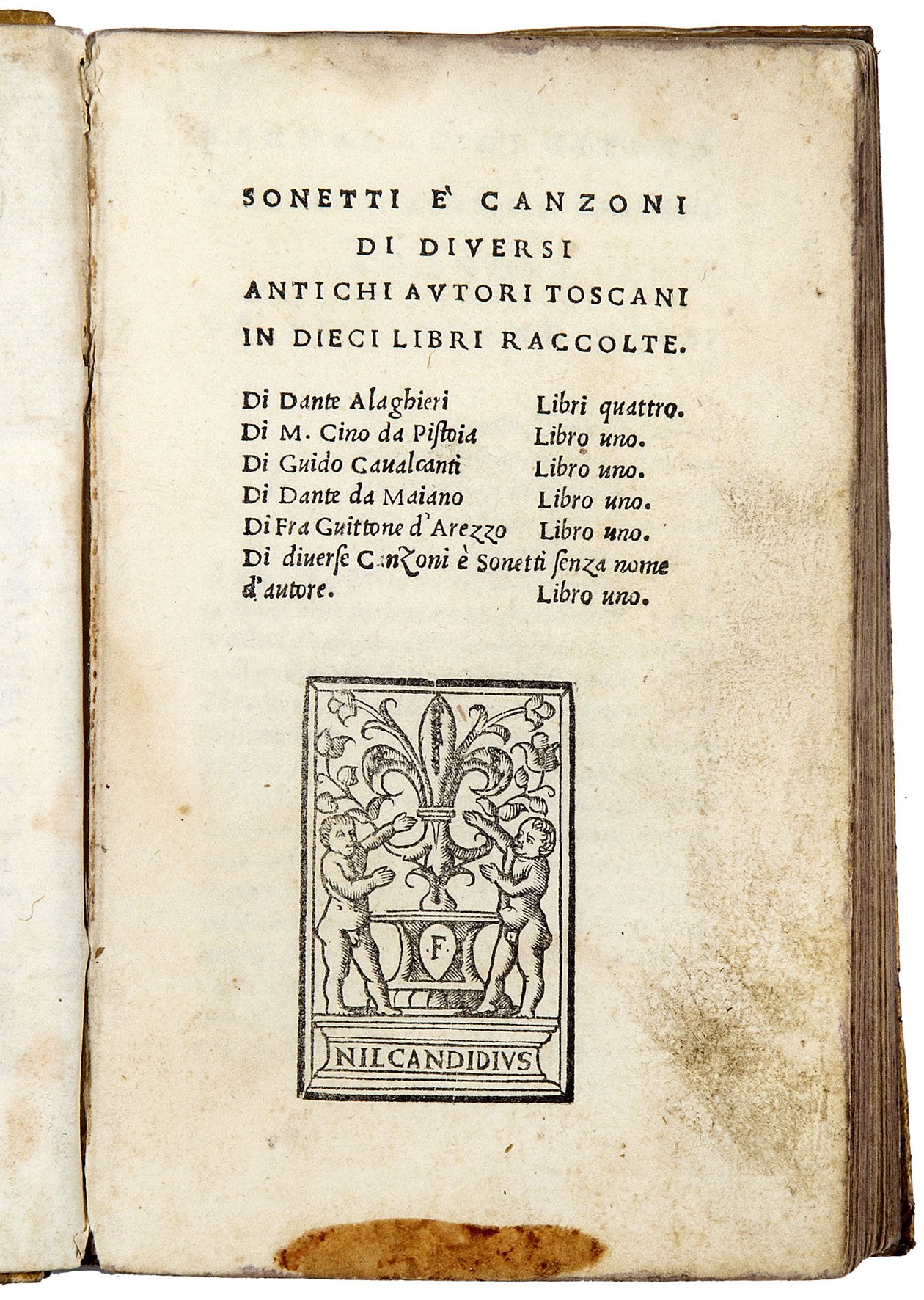 Sonetti e canzoni di diversi antichi autori toscani in dieci libri raccolte. Di Dante Alighieri libri quattro. Di M. Cino da Pistoia libro uno. Di Guido Caualcanti libro uno. Di Dante da Maiano libro uno. Di Fra Guittone d'Arezzo libro uno. Di diverse canzoni e sonetti senza nome d'autore libro uno