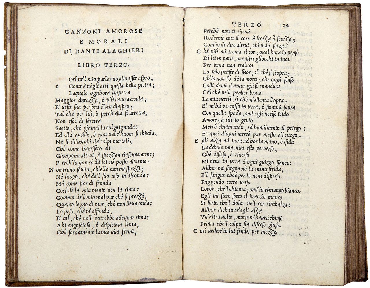 RARA E CELEBRE EDIZIONE Giuntina, curata da Bardo Segni e basata su vari testimoni manoscritti in parte perduti (cfr. D. De Robertis, a cura di, Sonetti e canzoni…, Firenze, 1977, I, pp. 24-27), che rappresenta un vero e proprio monumento all'antica tradizione lirica toscana e che raccoglie per la prima volta nella sua interezza il canzoniere dantesco. L'edizione si apre con una lettera prefatoria di Bernardo Giunti ai giovani amatori de le toscane rime. In fine (cc. 143-148) sono riportate le varianti testuali ritenute più significative.