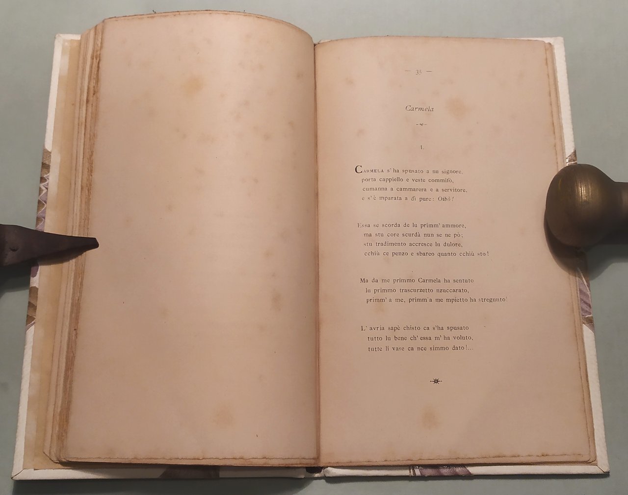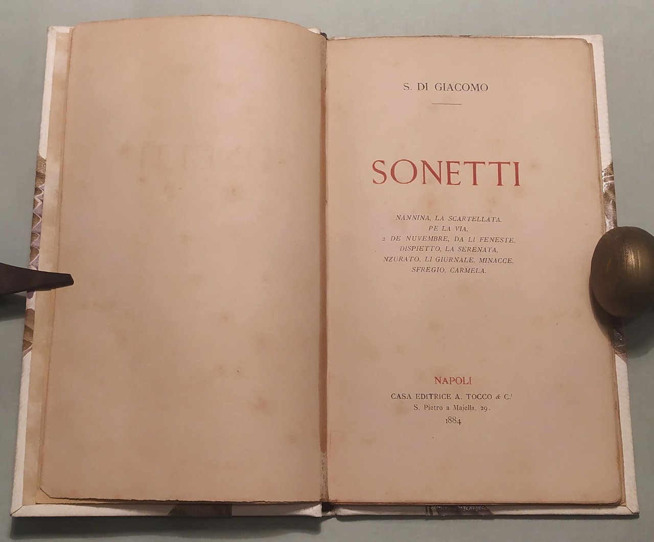 DI GIACOMO Salvatore. Sonetti. Napoli, Casa Editrice Tocco, 1884. In 16mo; pp. 41, 3 bianche. Mezza pergamena posteriore, copertine originali conservate in cartoncino grigio-azzurro, al piatto anteriore illustrazione di Paolo Vetri. Edizione originale. Schlitzer, 108. Da una recensione apparsa nel 1885 sul giornale Il Pungolo di Napoli: "… il volumino di Sonetti di Di Giacomo ha una squisita copertina sulla quale il Vetri ha disegnato la piu' bella popolana di questa città".