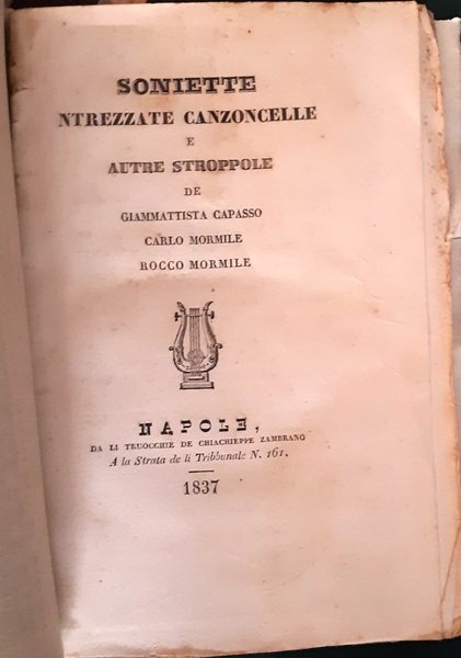 In-8°; p. 100, cartonato semplice. Con una lettera al lettore “quatto chiacchiere a chi s’addeletta de lejere”, in dialetto napoletano come i sonetti che seguono, in cui si difende “la lengua paisana” che è andata perdendosi a causa dei forestieri.