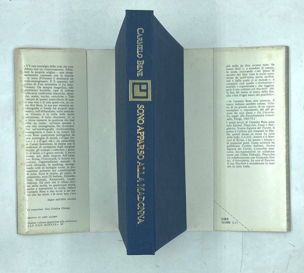 Tela editoriale con sovraccoperta illustrata, cm 21 x 14.5, pp 216 (6). Collana La Gaja Scienza, numero 69. Lievi segni d’uso e fioriture sulla sovraccoperta. Edizione originale di questa immaginifica autobiografia di Carmelo Bene, testimonianza diretta della «assoluta e persino patologica fusione fra arte e vita» (Giacchè, DBI) perseguita e realizzata dall’attore.