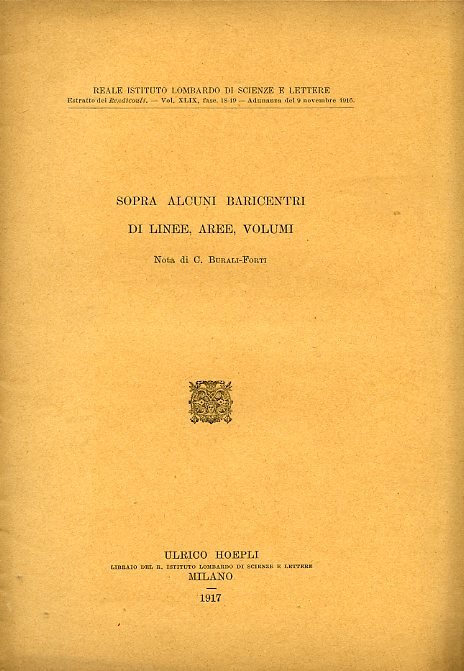 Sopra alcuni baricentri di linee, aree, volumi. Reale Istituto Lombardo di Scienze e Lettere. Estratto dai Rendiconti - Vol. XLIX, fasc. 18 - 19. Adunanza del 9 novembre 1916